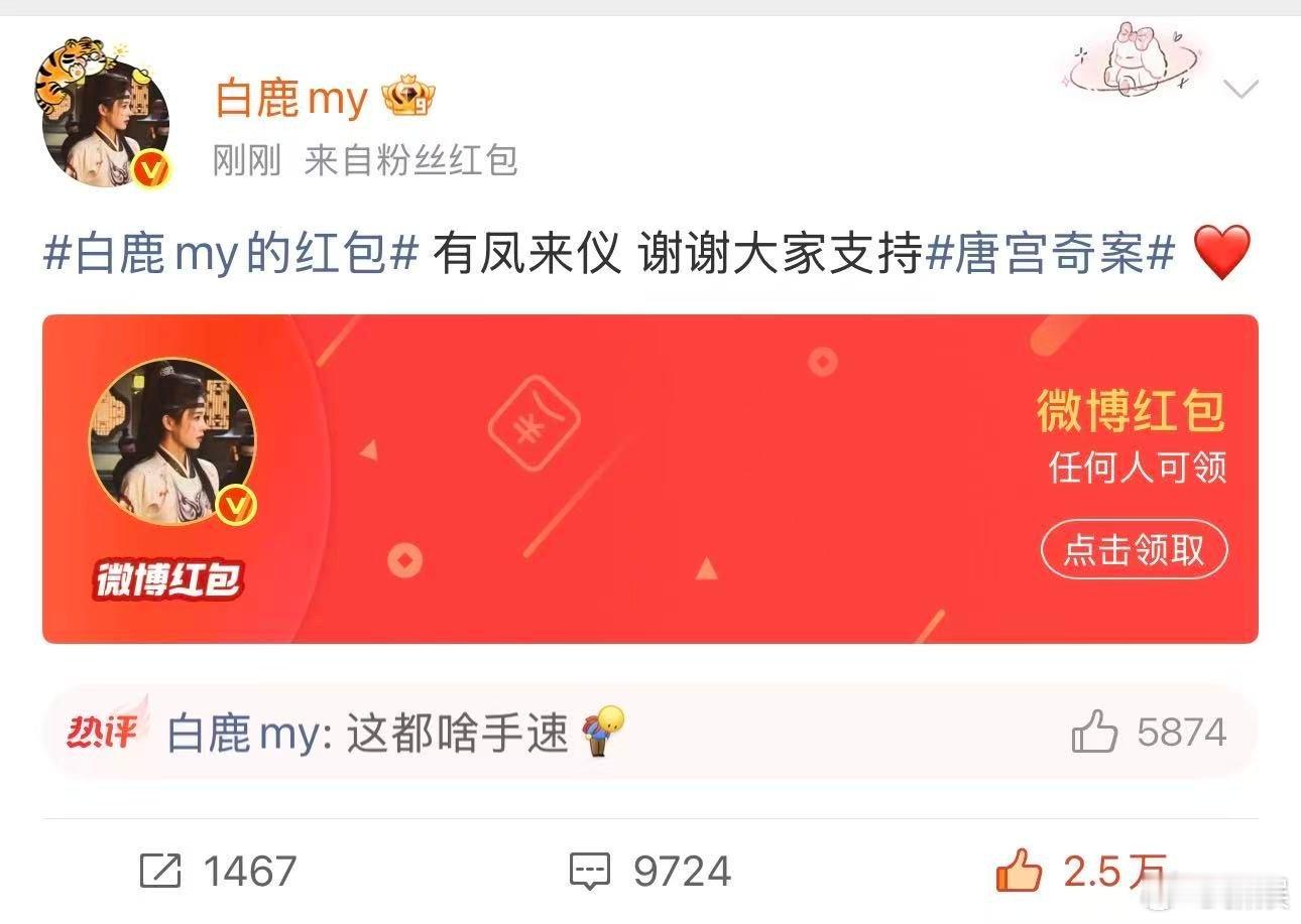 白鹿有凤来仪 白鹿用“有凤来仪”的美好寓意和实实在在的红包,与观众的双向奔赴,一起来支持我们唐宫奇案,多多支持我们李佩仪新娱
