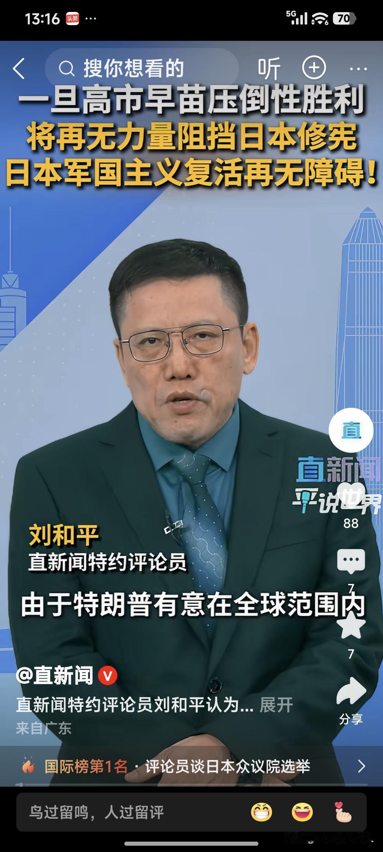 直新闻特约评论员刘和平:一旦高市早苗压倒性胜利,将再无力量阻挡日本修宪,日本军国主义复活再无障碍。 日本军国主义复活只是时间早晚的问题,挡住了高市早苗,还会有别的早苗出来。 明知中日不可避免,就不能对日本还抱有任何的“幻想”。此时,前怕狼后怕虎犹豫不决等同于“自残”,后果真的不堪设想!