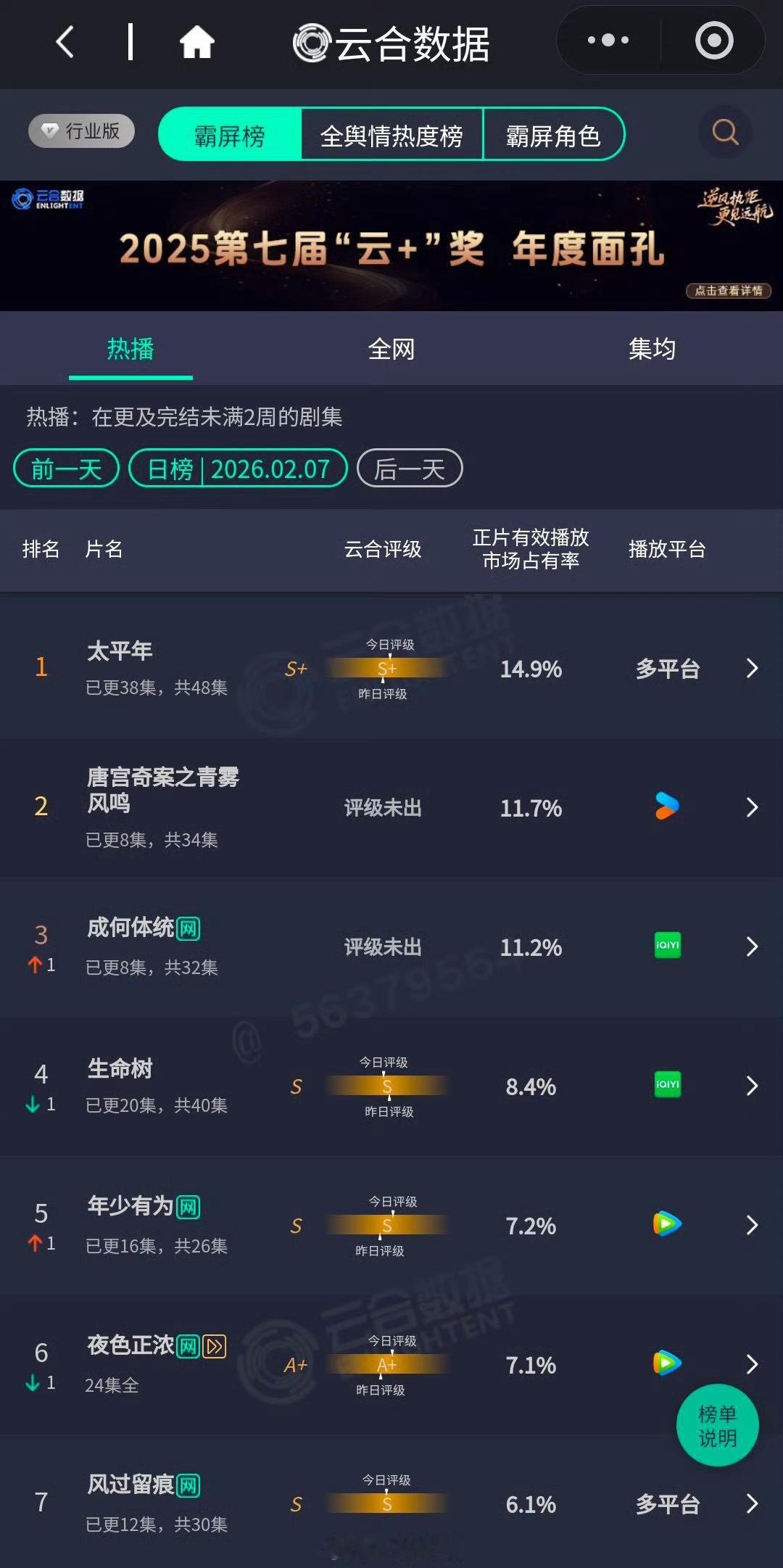 昨日云合白宇、周雨彤《太平年》14.9%白鹿、王星越《唐宫奇案之青雾风鸣》11.7%王楚然、丞磊《成何体统》11.2%杨紫、胡歌《生命树》8.4%龚俊《风过留痕》6.1%