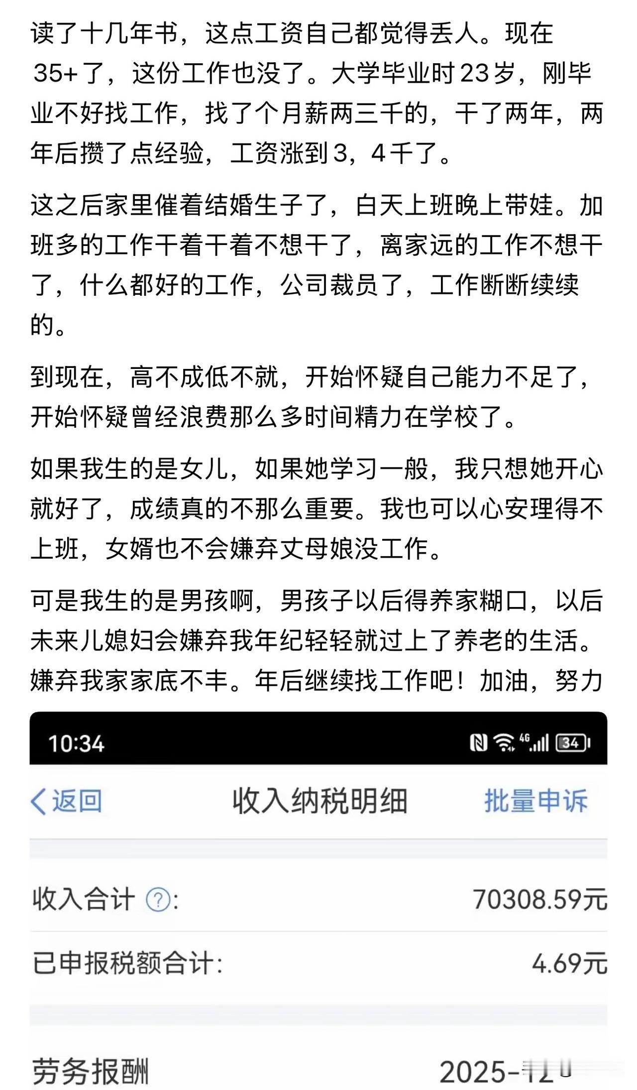 “读了十几年书,如今连份稳定工作都没有,这点工资说出去都丢人!”近日,一位35岁宝妈的自述,戳中无数中年人。23岁大学毕业,她起薪仅两三千,熬两年涨到三四千,却因结婚生子被家庭困住:加班多的扛不住、离家远的不愿去,好工作又遇上裁员,职场断断续续。如今人到中年直接失业,高不成低不就,她忍不住怀疑,多年读书到底值不值。 此话一出,不少网友深有同感:“太真实了,中年女性找工作全是枷锁,家庭孩子绑得死死的”。 也有网友更是坦言:“不是能力不行,是根本没机会拼”。” 看完这位宝妈的话,周少不得不说特别能理解这种感受。说直白点,这位妈妈的焦虑,藏着当下很多家庭的教育误区。 我们总逼着孩子死磕成绩,却忽略了生存能力、抗风险意识的培养,也很少教孩子如何平衡家庭与事业。 她因生了儿子,怕未来被儿媳嫌弃、怕帮不上孩子,才硬着头皮要重新找工作,这份无奈,恰恰说明教育不该只看分数,更要教会孩子要立足社会的底气。 当然,作为家长也应该明白,人生从不是单靠学历就能一帆风顺。不必过度苛责自己,平凡的努力,同样值得被看见。#寻美三湘#