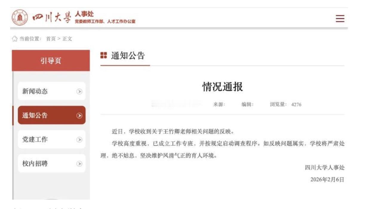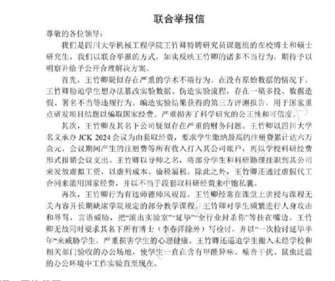 川大的一名博导被学生联名举报,而83页的举报材料中,不仅包括他学术不端的问题,甚至还有他的政治立场问题! 在评判这起事件之前,我们先看一下这起事情的来龙去脉。被举报的川大博导叫王竹卿,这个人可一点都不简单。他是川大机械工程学院特聘研究员,还是博士生导师,同时担任华西医院医学+制造独立PI教授,还是微机电系统与智能传感创新中心负责人,更是曾入选四川省天府峨眉计划创新领军人才。在今年1月份的时候师生关系破裂,学生开始对其进行实名举报。在经历了一个月整理材料后,在2月5日他的学生在社交平台上,公布了83页的举报文件。 在举报文件中曝光了他的四大罪行,第一、学术造假,将之前技术成果反复拆解发表,强迫学生篡改实验数据、伪造流程。第二、经济压榨,虚开学生工资偷税漏税,套取会议费用,用科研经费还房贷。第三、精神压迫,长期辱骂威胁学生。第四、立场问题,在日本拥有永久居住权,在工作群内宣扬日本文化,甚至还特意把中日韩会议,定在九一八纪念日。而且里边不是空口白牙的话语,而是有一些图文实证。 这一份83页的举报文件,在网上曝光之后,立马就引发了大的舆论。而很快川大对此做出了回应,称高度重视已成立工作专班,启动了调查程序。并且还表示,如果反映属实绝不姑息。从网上所曝出的83页举报材料来看,有理有据还很详实,所以大概率上不会冤枉王竹卿。那如果的确属实的话,他将会面临什么样的后果呢?被川大解聘已经是最轻处分,他还将会面临着行政追责与刑事上的处罚。 除非他是去国外发展,否则的话国内的高校,将再无他的容身之地,他国内的学术生涯,基本上完全葬送了。事实上我想说的是,近些年类这类问题,在学术圈内并不少见。只不过很多时候高校为了脸面,往往都会选择秘而不宣。只有实在瞒不住的情况下,才会向社会进行通报。而类似问题的背后,是有学术评价体系的问题,但最主要的还是,导师拥有绝对权威,还有就是监督机制的形同虚设。 虽然这些研究生,表面上看是跟导师是平等的,可事实上导师拥有绝对发言权。他能决定资源的分配,也能决定你是否能顺利毕业。在这样的情况之下,学生就会处于绝对弱势。而为了顺利毕业,一些学生不得不委屈求全。而一些心黑的导师,更是为了获得免费劳动力,拼命压榨自己的学生,甚至不惜让学生延迟毕业。而一些高校虽然设有学术委员会等监督机构,但就算是接到举报之后,往往也都是内部处理。如果涉事导师能量大,倒霉的还是学生。 因此一般情况之下,哪怕是学生受了很大的委屈,但也很少会有联名举报导师的,除非是导师已经没了底线。所以从这也可以看出,这个王竹卿的到底有多可恶。而想要避免类似的事件发生,还是要从监督机制上入手,否则今天出了一个王竹卿,明天就又可能出一个李竹卿。