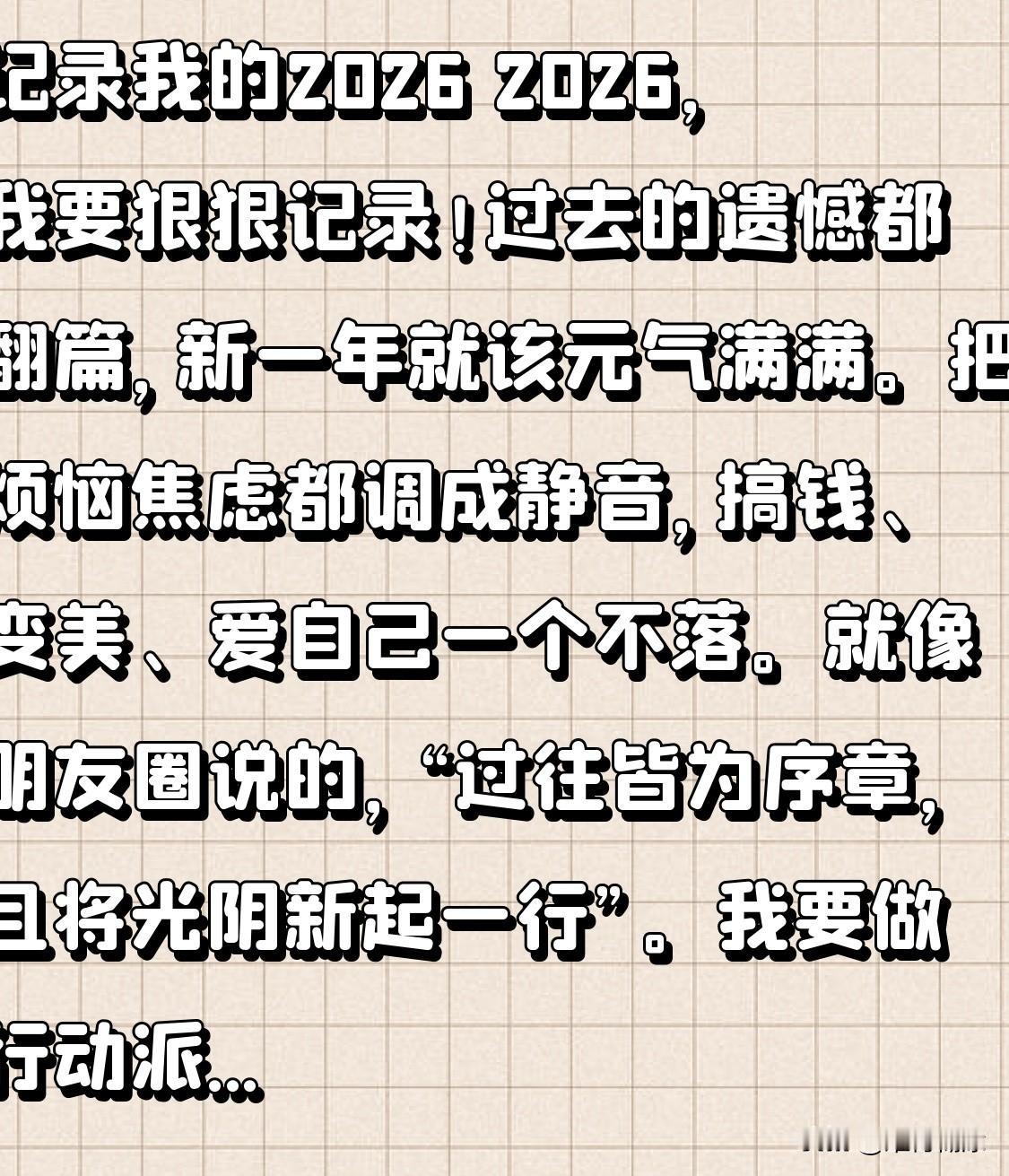 记录我的2026 2026,我要狠狠记录!过去的遗憾都翻篇,新一年就该元气满满。把烦恼焦虑都调成静音,搞钱、变美、爱自己一个不落。 就像朋友圈说的,“过往皆为序章,且将光阴新起一行”。我要做行动派,每一步都算数。新的365天,愿三餐四季温暖,自己也能闪闪发光,旺到离谱!