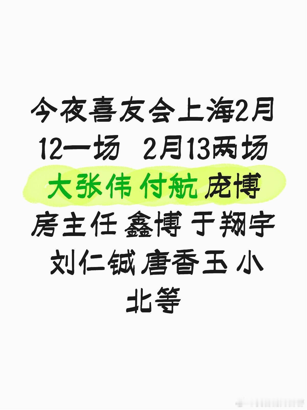 今夜喜友会上海2月12一场 2月13两场大张伟 付航 庞博 房主任 鑫博 于翔宇 刘仁铖 唐香玉 小北等