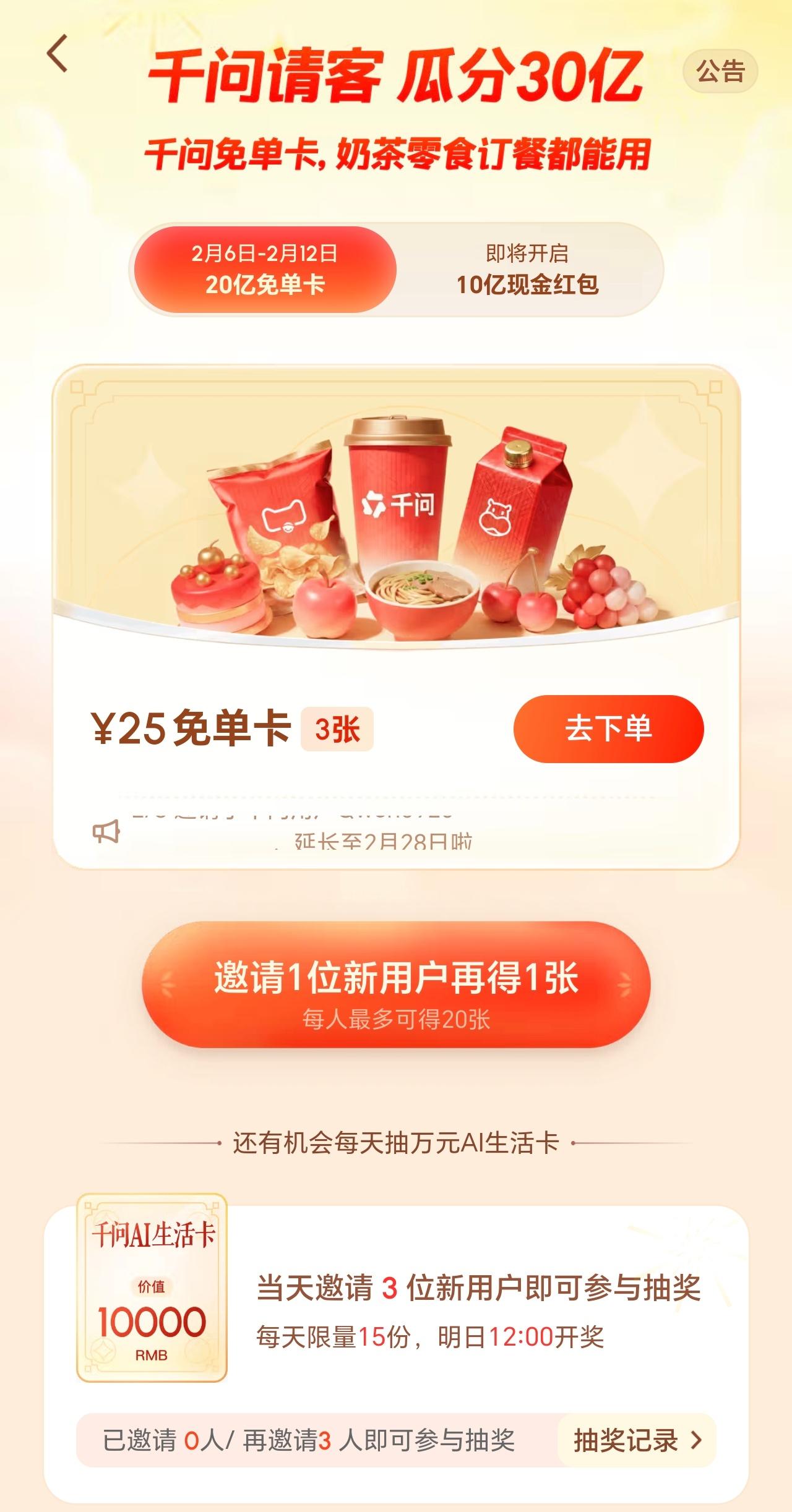 羊毛党看过来,千问全国人民吃喝玩乐的福利可别错过了。下载千问APP即刻参与活动,邀请好友还能最高得20张免单卡,相当于千问帮你免费置办年货,还犹豫啥呢,赶紧冲啊。