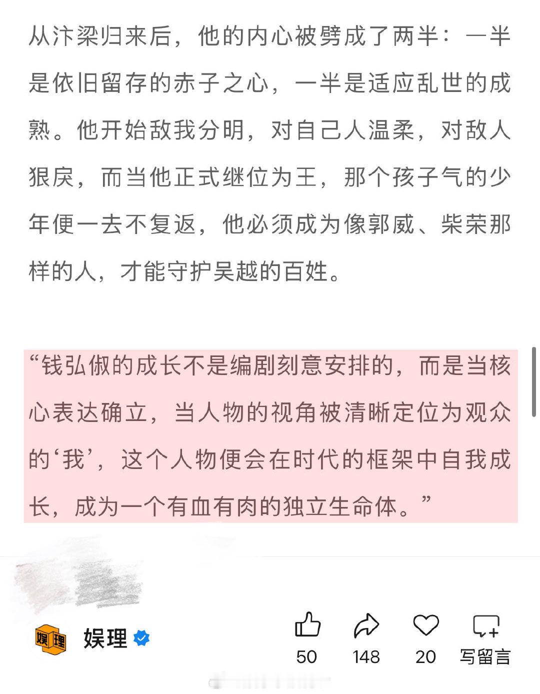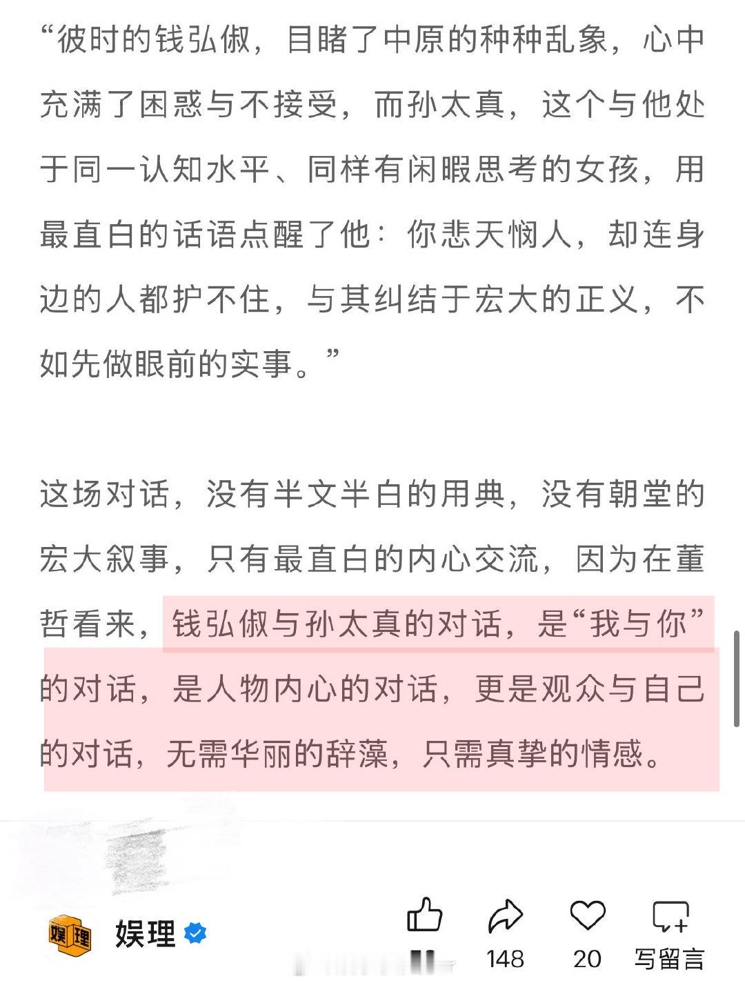 太平年编剧谈历史正剧创作边界 太平年编剧说五代十国没人能躺平 《太平年》编剧董哲谈钱弘俶和孙太真的关系:“钱弘俶目睹了中原乱象,心中充满困惑,与他处于同一认知水平、同样有闲暇思考的孙太真,则用最直白的话语点醒了他:你悲天悯人,却连身边的人都护不住,与其纠结于宏大的正义,不如先做眼前的实事。”娱理独家↓