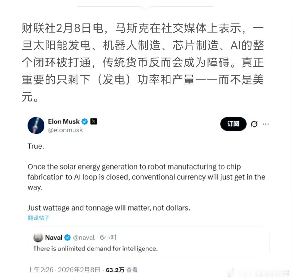 马斯克说:一旦太阳能发电、机器人制造、芯片制造、AI的整个闭环被打通,传统货币反而会成为障碍。真正重要的只剩下(发电)功率和产量——而不是美元。 马斯克这句话什么意思?沃试着给大家讲解一下,要知道美元能成为全球通用结算货币,是因为控制了石油能源,绝大数石油出口国用的是美元结算,让美元成为全球贸易结算货币。现在时代变了,AI时代来临,需要巨量的电能源,电能源会逐步取代石油能源,也就说谁的电能源多谁就有话语权,谁的电能源多,谁的货币就和电挂钩,电币合体。很显然目前全球咱们的发电量是最多的,咱们在电能源时代已经胜出和电有关的板块一定会成为主线会走慢牛长牛,电网、特高压、变压器、智能电网等等有超级大机会。