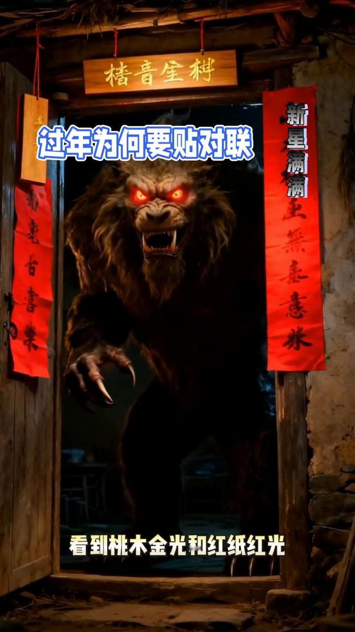 过年为何要贴对联? 很久很久以前,每到除夕,年兽便会祸害人间。这一年除夕,村民正准备逃难,一位老者突然出现。老者在桃木上刻下神荼郁垒的名字,又在红纸上写下吉祥对联。屋内烛光摇曳,年兽最怕红色、火光和声响,看到桃木金光和红纸红光竟浑身发抖。看着老者点燃爆竹,声响震天,年兽狼狈逃回深海。村民们回来发现村庄完好,老者却已不见踪影。从此,贴对联成了新年驱邪纳福的吉祥仪式。