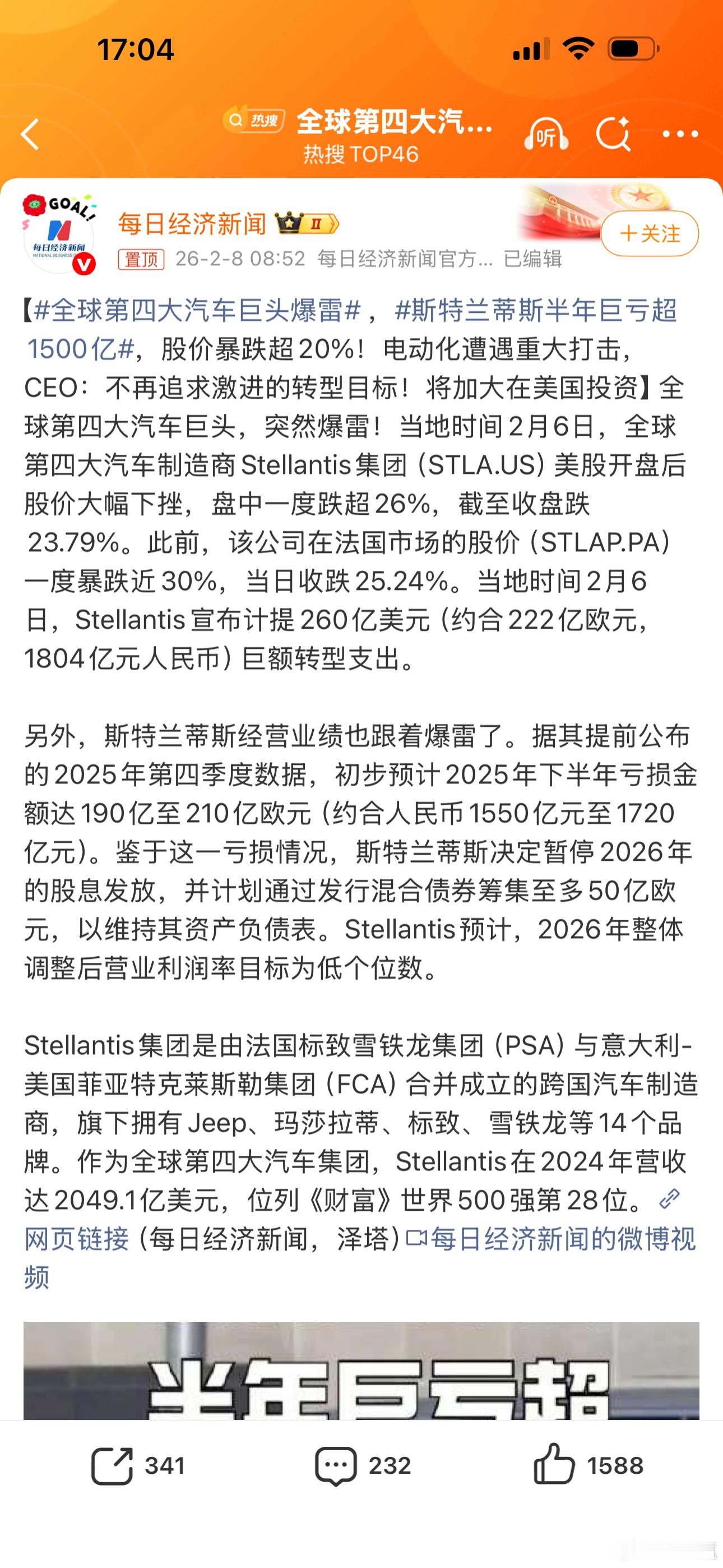 全球第四大汽车巨头爆雷Stellantis集团是由法国标致雪铁龙集团与意大利-美国菲亚特克莱斯勒集团合并成立的跨国汽车制造商,旗下拥有Jeep、玛莎拉蒂、标致、雪铁龙等14个品牌。作为全球第四大汽车集团,Stellantis在2024年营收达2049.1亿美元,位列《财富》世界500强第28位。半年亏损1500亿,看来大家的日子都不好过。所以要好好爱护这些车企