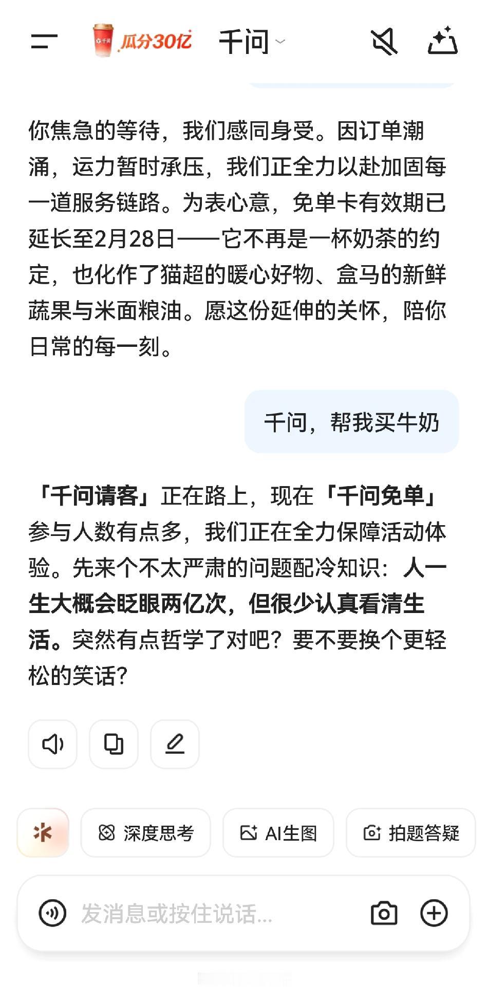 千问这个春节红包真不真啊。免费喝牛奶,喝奶茶,吃薯片。都在排队中。 排到我是不是就活动结束了。 有薅到羊毛的没?