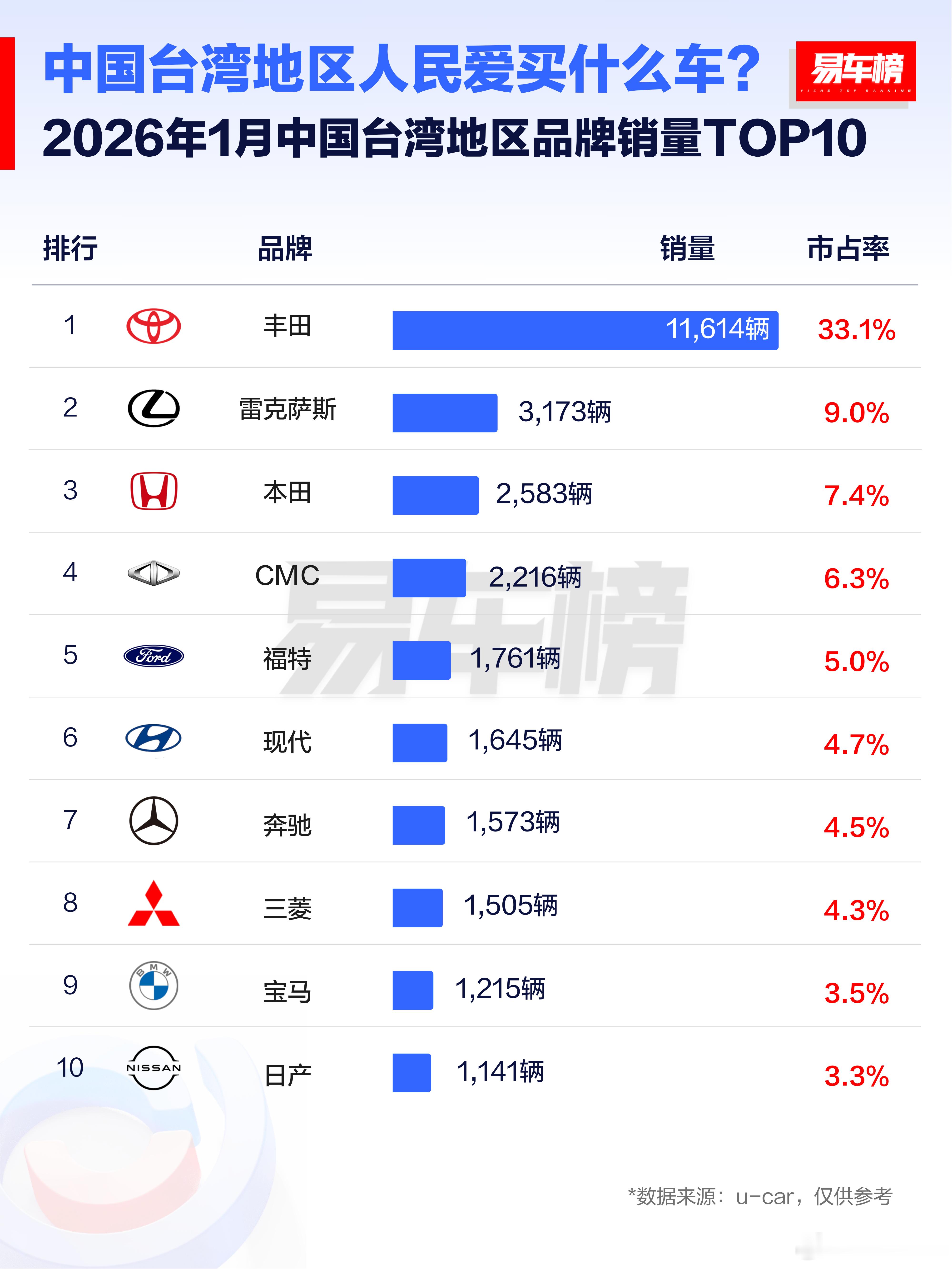 台湾还是有钱,前十的榜单里面,豪车品牌占据30%。