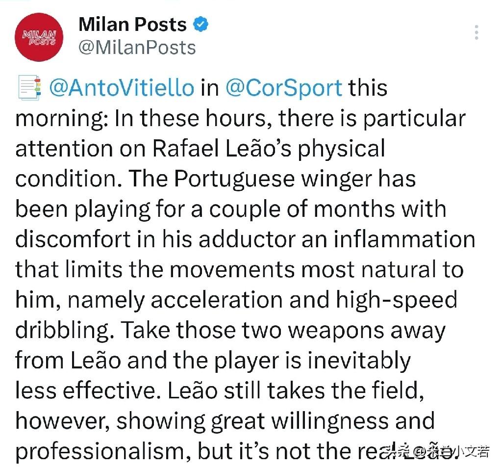 莱奥!莱奥的内收肌炎症依然没有好转,阿莱格里为米兰全队放假三天,伤病名单中的普利西奇与萨勒马克尔斯在米兰内洛加练,而莱奥并没有像之前那样来到训练场主动选择加练,有消息说原因是莱奥依然受困内收肌炎症中。 速度见长的莱奥由于内收肌炎症导致他在比赛中无法发力,虽然如此但莱奥依然希望能代表球队出战,莱奥在本赛季展现了出色的职业精神。上场比赛莱奥是在替补席,但并没有出场,估计是问题有点麻烦,否则领先情况下如果莱奥没啥大事,肯定会上去找找状态,肯定是比较严重,所以才没有出场。 莫雷托昨天消息称莱奥与普利西奇受伤病困扰已经超过两个月时间,进入到一月后普利西奇就停止了进球,而莱奥则是不见了突破,他们均受到伤病困扰。这个事情莫雷托不说我们也觉察到了问题,莱奥之前比赛虽然有进球与助攻,但他的突破确实出了问题,当时还有人说莱奥这是转型成功了,现在看来应当是一直受伤病困扰。