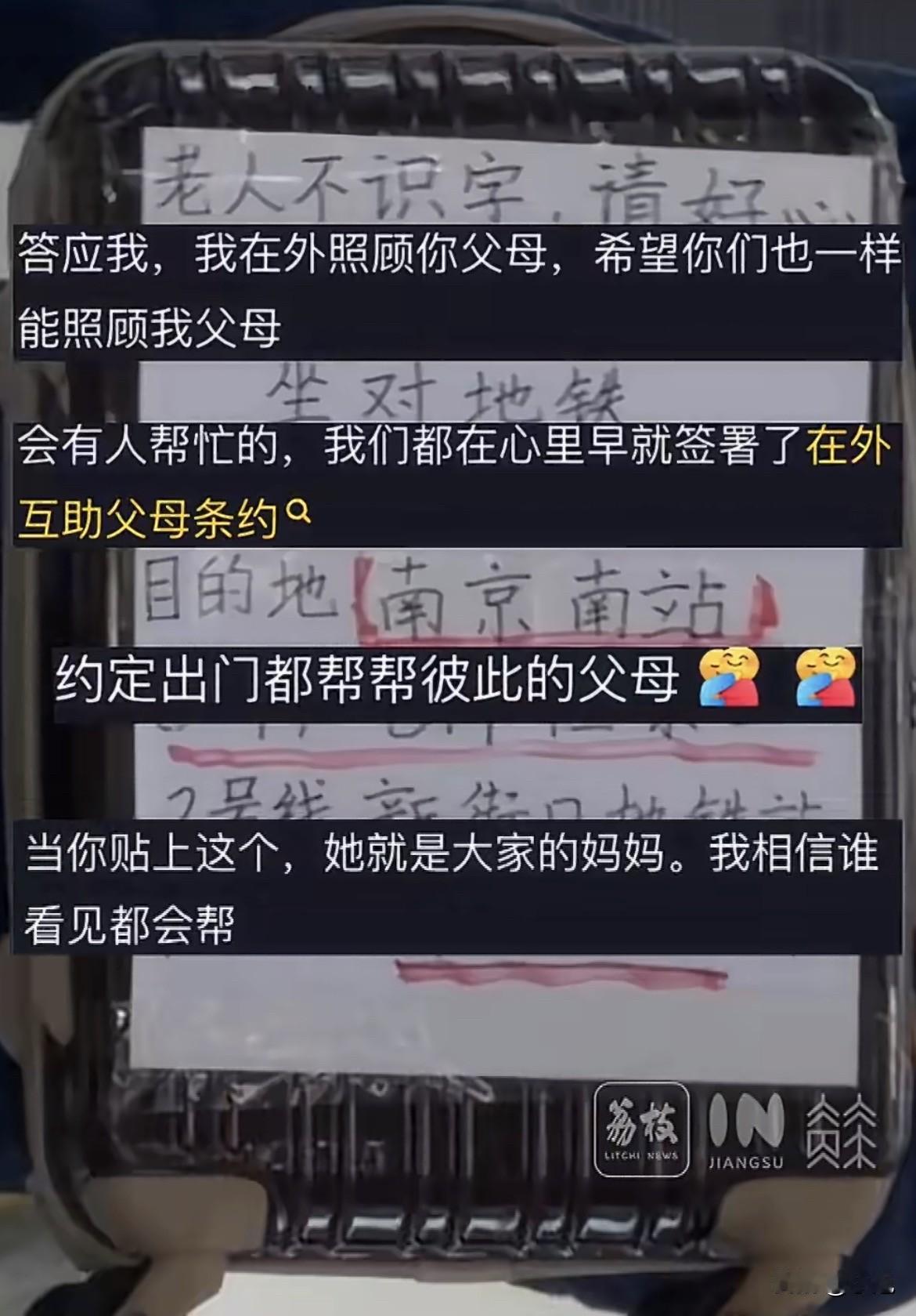 泪目了。一位老人独自坐火车,行李上贴着一张纸条,写着:老人不识字,请好心人帮忙提醒坐对地铁、到站下车。 这张纸条是一个信号。一个向陌生世界发出的、谨慎而温暖的求助信号。 老人或许不明白什么是“数字鸿沟”,但他清楚地知道,自己在复杂的换乘线路和飞驰的列车面前,需要一双眼睛。他的办法如此原始,却又如此直接。 这种用纸条求助的办法,正在很多老人身上发生。在重庆,一位迷路的老爷爷,从包里翻出一张折好的A4纸。上面是老伴的笔迹:“吃饭前记得吃药”、“不要吃糖”、“不要乱跑”。靠着纸上的电话,公交司机帮他找到了急哭的老伴。 更揪心的是在一趟列车上。一位老人突发疾病,口吐白沫,意识模糊。大家在他包里翻找,最终找到两张写着电话号码的纸条。就是这两张纸,让列车长在信号断续的路上,打了近十个电话,辗转联系上家属,为抢救赢得了时间。 纸条能救命。这轻飘飘的纸,有时候就是老人和外界之间最重的保险绳。 也有没带“保险绳”的时候。在哈密车站,一位八旬老人茫然徘徊。他说不清行程,身上没有手机、没有身份证,也没有任何纸条。民警只能通过人脸识别技术才找到他的家人。对比之下,那张提前写好的纸条,显得多么有先见之明。 看到老人的需求,一些地方的服务走到了前面。在南京南站地铁站,有一种“信鸽服务”。工作人员会把复杂的换乘路线,一笔一画写在纸条上,交给问路的老人。这项服务已经默默坚持了六年,累计帮了大约两万人。 他们还有“彩虹便民条”,把常问的路线用不同颜色打印出来,挂在窗口。从口头指点到手写纸条,这个小改变,对记性不好的老人来说,是场“及时雨”。 社区也在行动。太原某个社区的网格员,会手写一些小纸条,送到独居老人家里。提醒关煤气,写下紧急联系电话。纸上的字迹带着温度,就是要告诉老人:有人惦记着你。 这张小小的纸条,正在进化。从个人自发的求助,变成了系统性的服务,现在,它甚至要变身为一个“信号”。 在西安,一个叫赵晨的年轻人,因为母亲曾受助于陌生人,开始制作“拍拍卡”。最初的版本就是一张写着“需要帮助请拍拍我”的纸。后来,它升级成了更精致的卡片。最新的第三代卡片,甚至嵌入了芯片。 扫码能呼叫家人,能共享急救信息。这张卡不再只是年轻人的助人标志,它提倡“平权互助”。老人也可以佩戴,用图案告诉别人:“我需要帮助”,或者“我可以提供帮助”。目前,已经有超过17万人响应了这个倡议。 从一张贴在行李上、字迹或许有些颤抖的纸条,到一枚融合了芯片技术的智能卡片。形式在变,但内核没变:那是一种不放弃沟通、不放弃连结的努力。 那位火车上的老人,他贴出的不仅是一张纸条。他贴出的是信任。他相信,这个匆匆忙忙的世界里,总会有人愿意为那行歪扭的字停下脚步。 于是,我们看到网友说:我自愿签订《在外互助父母条约》! 我们帮的是别人,也可能是在帮某个瞬间无助的自己,或是在帮将来某一天也会变老的自己。 今天,如果你在路上看到一位有些迟疑的老人,或者看到他行李上有一张小小的纸条,你会怎么做?