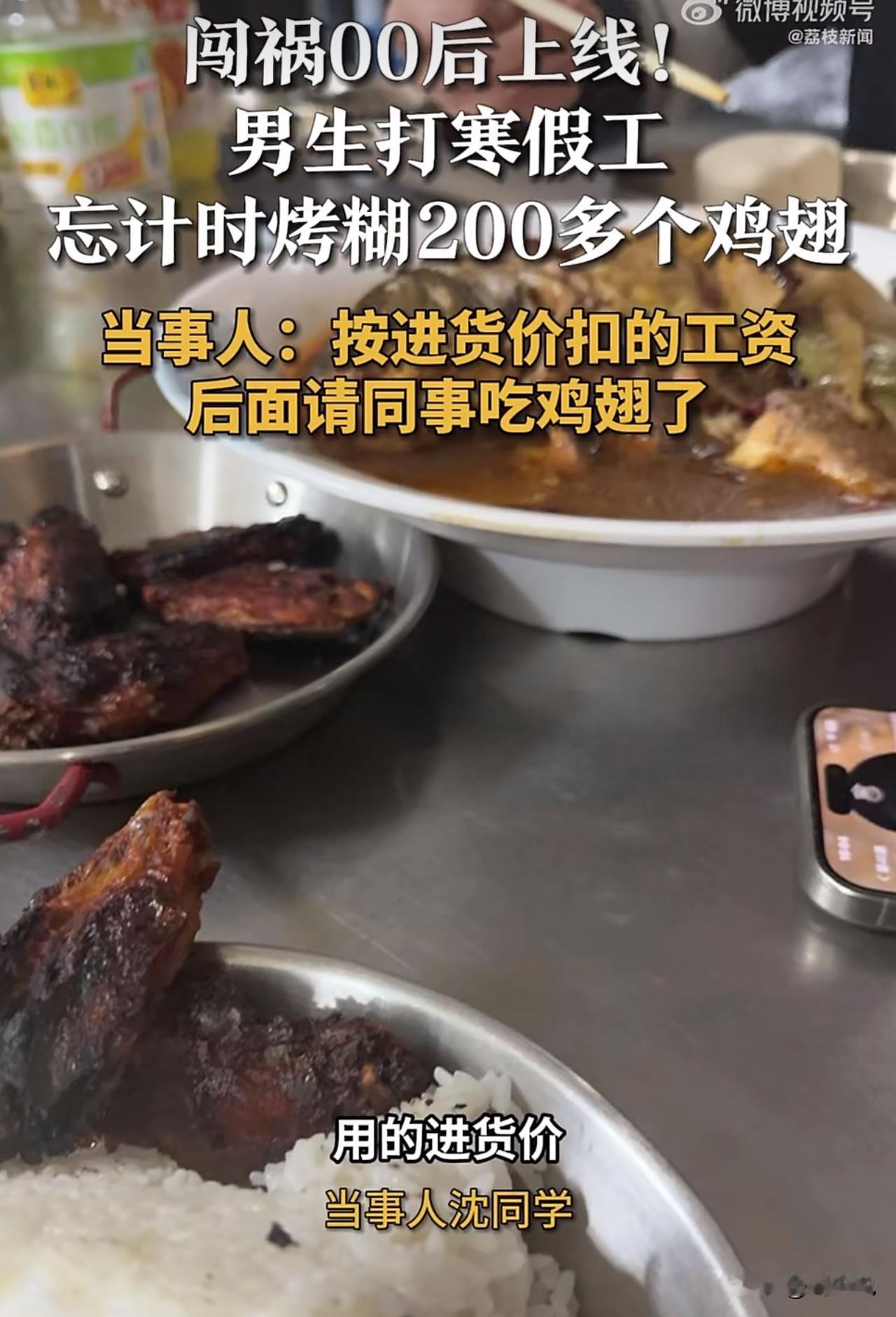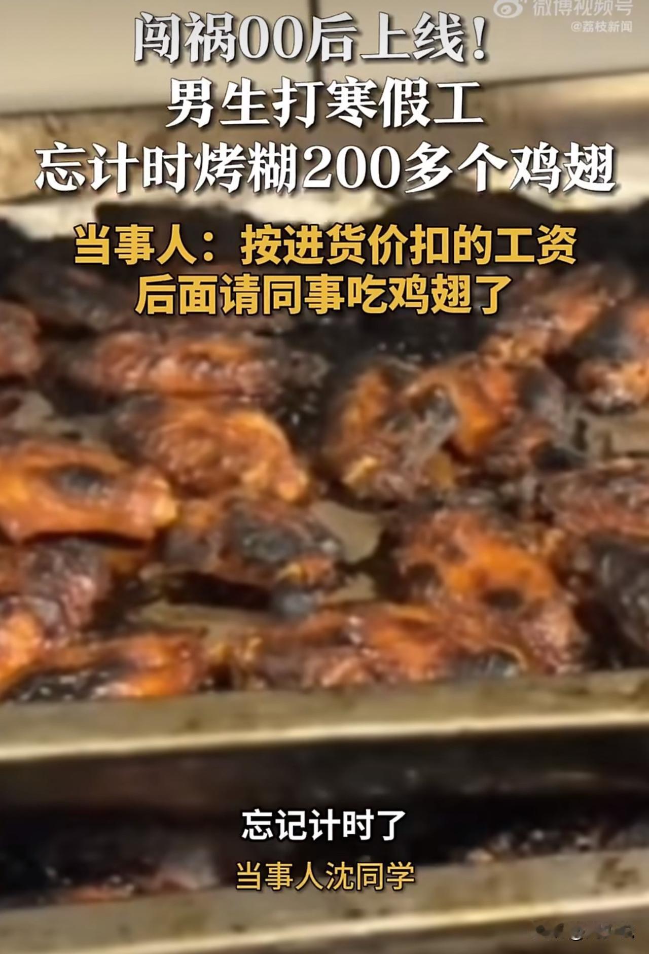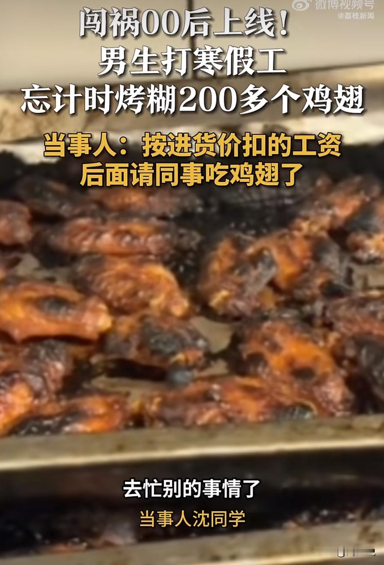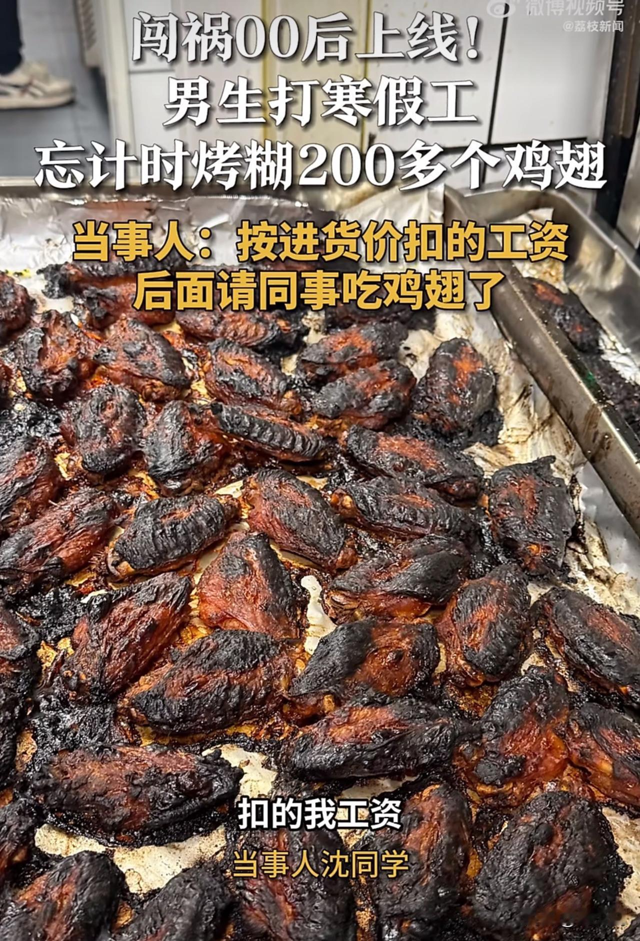 “笑哭!”近日,山东济南一位男生寒假兼职,竟一次性烤糊两百多个鸡翅,这事在网上引来不少热议。 据该男生说,当时把鸡翅放进烤箱后,忙着做别的事,完全忘了设计时器,等想起来打开烤箱,整个人都懵了,满满一炉鸡翅,全烤焦没法卖。老板也没苛责太多,只是按进货成本扣了他部分工资,最后这些烤糊的鸡翅,他也没浪费,全都请同事一起吃掉了。 此事曝光后,有网友调侃:“新手打工果然容易翻车,这学费交得有点贵。” 也有人说:“老板挺厚道,没漫天要价,孩子也懂事,没抱怨。” 其实这件小事,周少倒挺值得家长和学生琢磨。寒假打工本是锻炼独立、体验生活的好机会,可很多孩子缺少实操经验,对时间管理、细节把控也不够上心,难免出现这类小失误。 可以说,一次烤糊鸡翅,算不上多大的错,却能让人真切体会到:职场里每一个小疏忽,都可能带来实实在在的成本与责任。 比起单纯扣钱、批评,这样的亲身经历,反而更能让人记住规则、学会负责。年轻人多摔几次小跟头,慢慢把细心和责任心练到位,未来走上社会,才能少走弯路、更稳地立足。#寻美三湘#