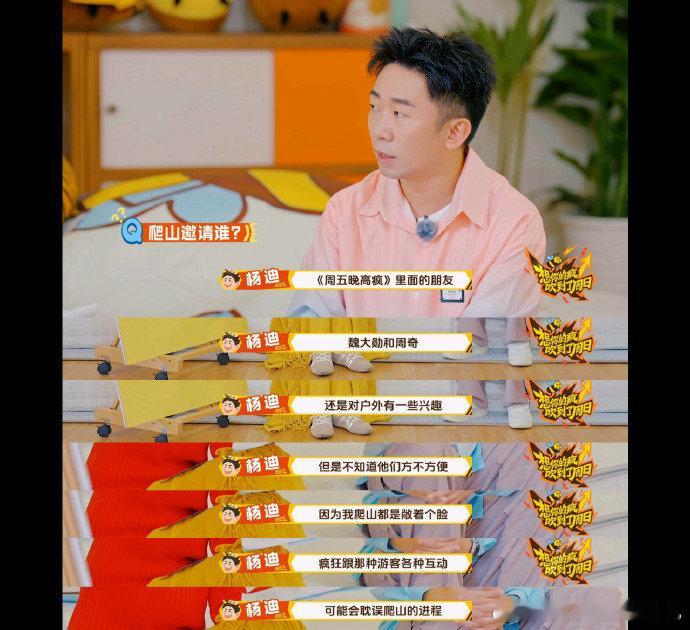 杨迪想约魏大勋一起爬山杨迪魏大勋约爬山也太有梗了,俩人的综艺感拉满,周五晚高疯这波糖我先嗑为敬~周五晚高疯