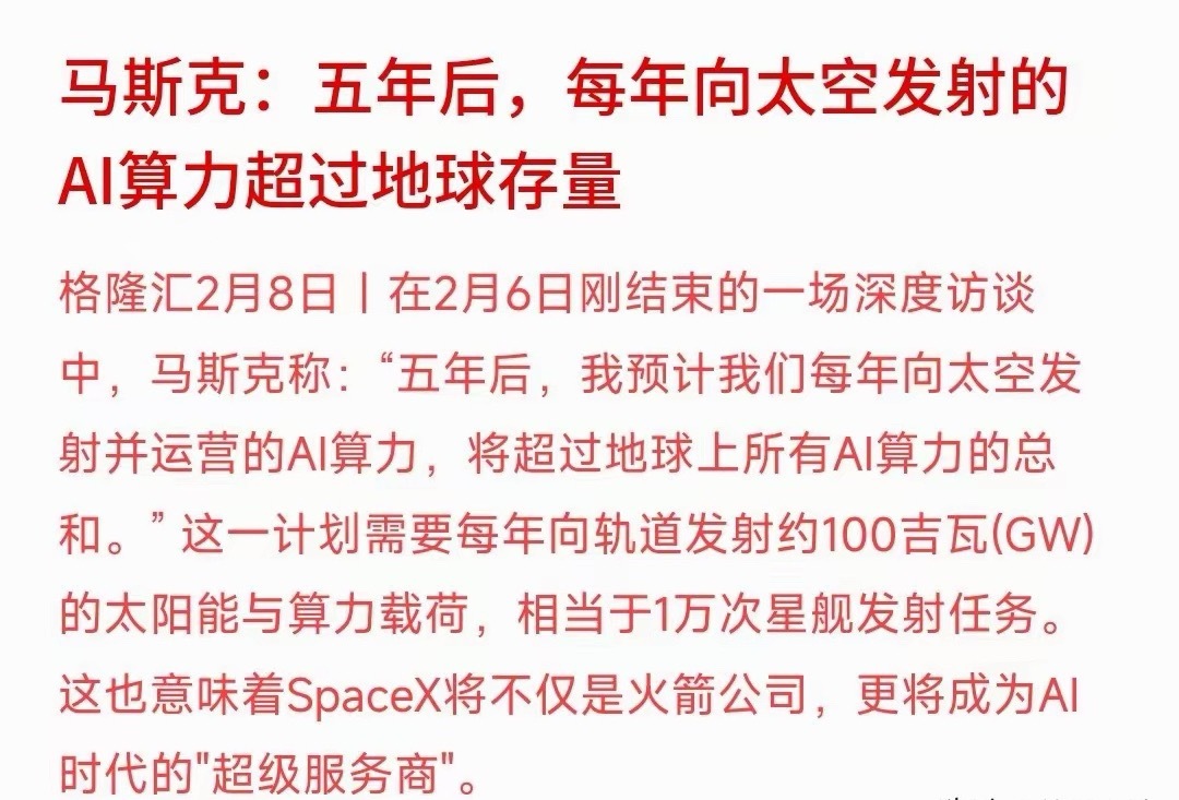 航天军工和算力周末迎来重磅利好消息,周一板块开盘基本稳了。马斯克表示:五年后,我预计我们每年向太空发射并运营的AI算力,将超过地球上所有AI算力的总和。简单来说:过去算力是地球基建,未来太空会成为核心补充,甚至是高端算力的主阵地,后续其他科技巨头大概率会跟进布局太空算力,也就是说可能会出现太空算力布局竞赛。当然太空算力竞赛就需要发射火箭,这就会让商业航天再次成为真正的受益者。目前,商业航天板块和算力板块都已经调整下来了空间,马斯克的言论会让板块再次得到刺激,周一还是可以期待的。
