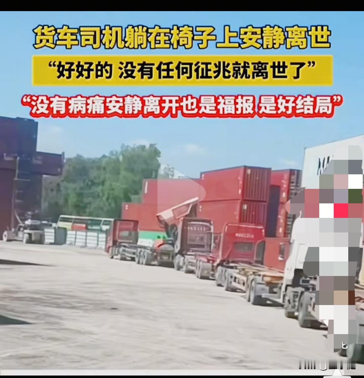 看到这个图,瞬间泪奔![流泪]都要过年了,一位货车司机却再也无法回家了,他的生命永远停留在了那一把简易的椅子上。 他是开挂车的司机,好不容易有点空闲,他便拿出一把折叠椅子在车旁边休息一会。没想到,就在这个空档里,人就没有了。 更令人心疼的是,他在离开之时,身边没有一个人,陪伴他最后一程的竟只有一瓶功能性饮料。 根据网友提供的图片来看,这位大哥的年纪并不大,估摸着就是四十来岁的样子。这个年纪,上有老下有小,他可能会是家庭里最主要的顶梁柱。 这个时候,距离过年越来越近,很多在外的游子们都已经相继返乡。他的家人、孩子、父母,也肯定在眼巴巴等着他回去相聚。可突然之间发生了这样的事情,真的不敢想他的家人该有多么遗憾和痛苦啊? 在这个事件背后,有网友表示,一个人可以无痛无病就离开,是一种福报! 其实,我个人不赞成这个说法。因为,针对这个大哥的情况来讲,这句话显然是真的很不合适。 第一:他还很年轻,身上的责任感还很重。 第二:他自己都没有一点准备,完全就是意料之外的事情。 他走的如此仓促,一点心理准备都没有,连一句话都来不及和家人交代,这种情况对于他的家人而言,真的太残酷了。这种伤痛,是一辈子都难以痊愈的。 普通人的一生,真的很不容易。谁也不知道,明天和意外究竟谁先来。所以,我们能做的,只有好好珍惜每一天,在有限的生命里,好好的爱自己、爱家人。 在此,愿这位大哥一路走好,也希望他的家人要坚强起来,节哀顺变![祈祷][祈祷][祈祷]