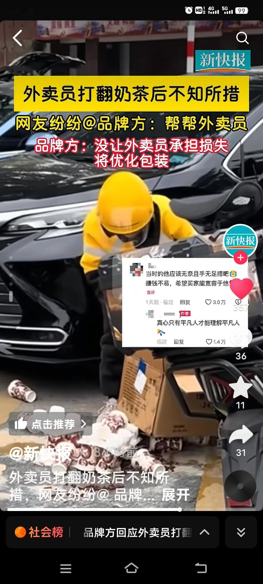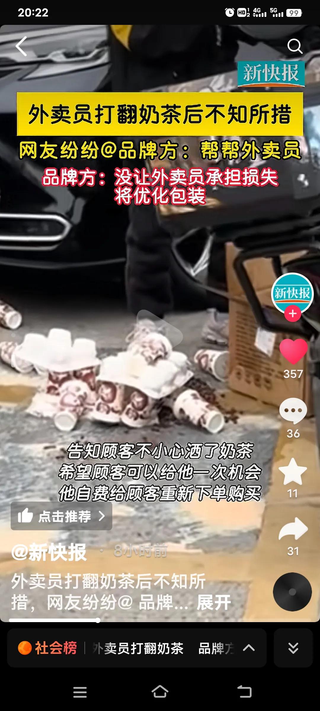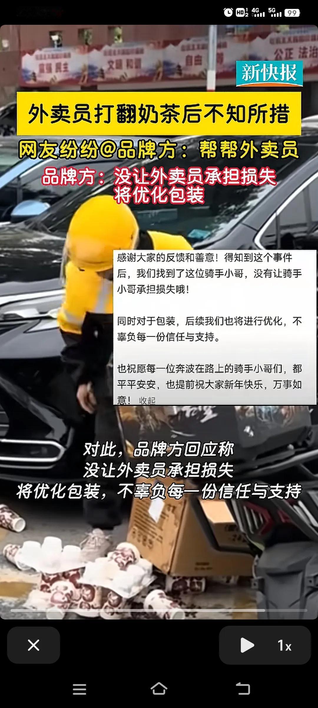福建莆田,一名外卖小哥不慎打翻了32杯奶茶,呆立原地,一脸茫然无措。他并未逃避责任,本打算自掏腰包为顾客重新购买奶茶,恳请顾客再给他一次机会。那一幕,着实让人感到心疼。 这一幕被路人撞见并拍成视频发至网上,网友们纷纷对外卖小哥同情,品牌方:帮帮这位外卖员吧!品牌官方看到视频后,找到了外卖小哥,不仅没有让他承担损失费用,还表示会重新优化包装,同时祝福每一位外卖小哥都能平平安安。 不得不说,品牌方的这波反应十分暖心!这才是品牌方应有的模样,多一份关心,就能让外卖小哥少一些精神负担。大冷天里,他们着实不易。 如今外卖行业如此火爆,包装的重要性不言而喻。也希望外卖小哥们能多加小心,有时过于心急反而会让事情变得更糟。这次幸亏品牌方宽宏大量,不然外卖小哥得赔偿不少钱呢! 外卖奶茶 外卖哥奶茶 闽侯外卖