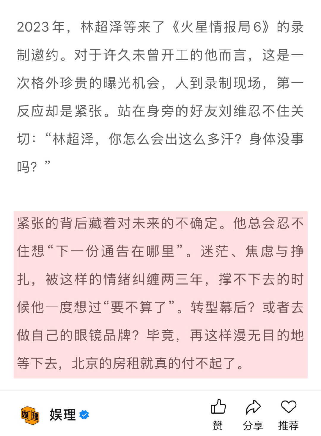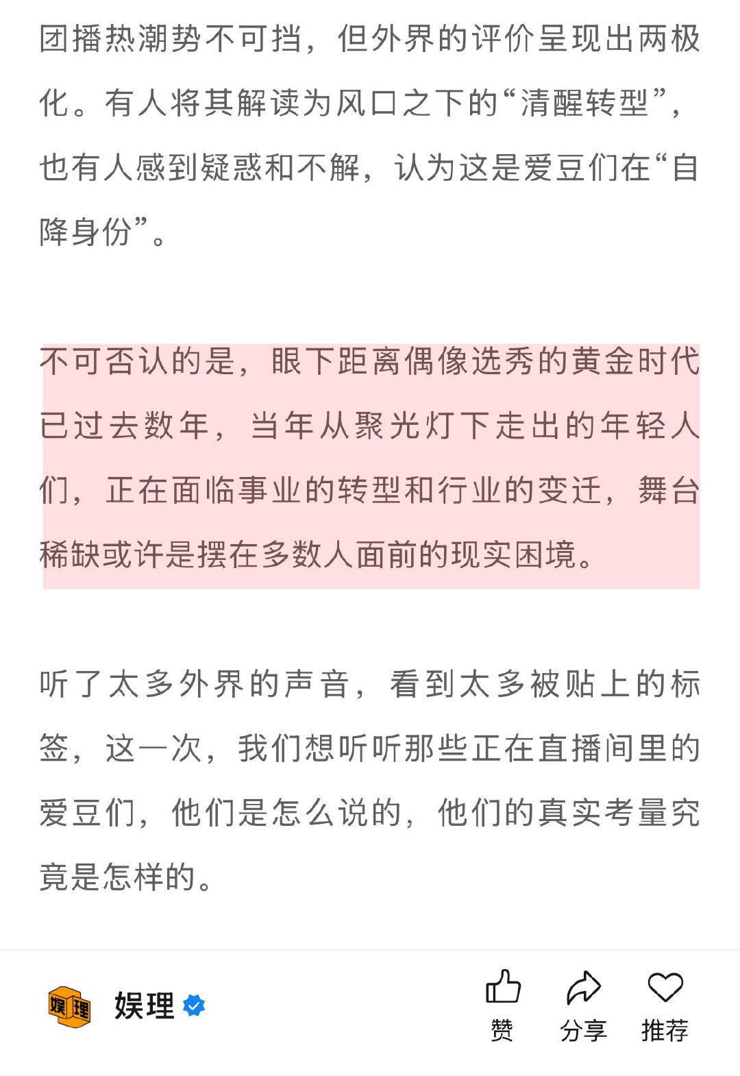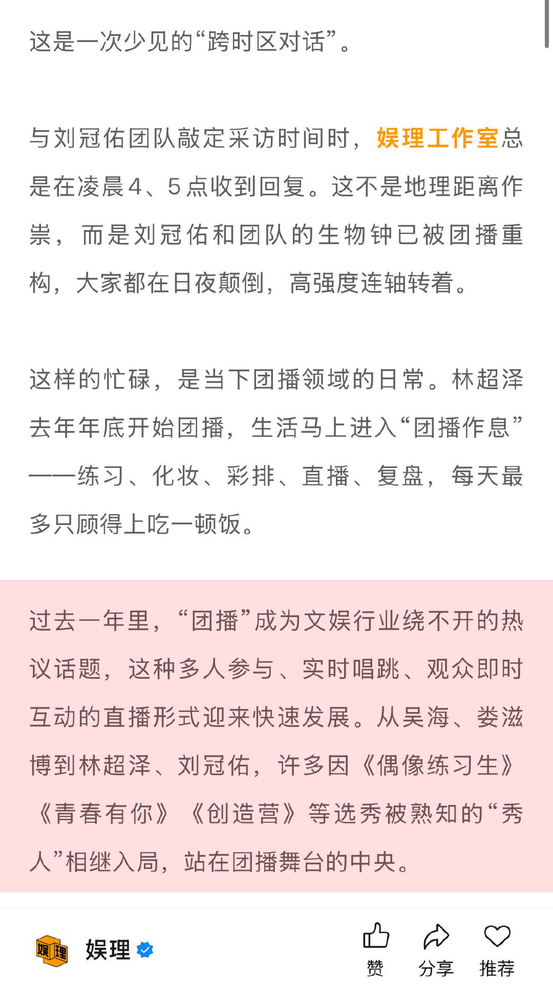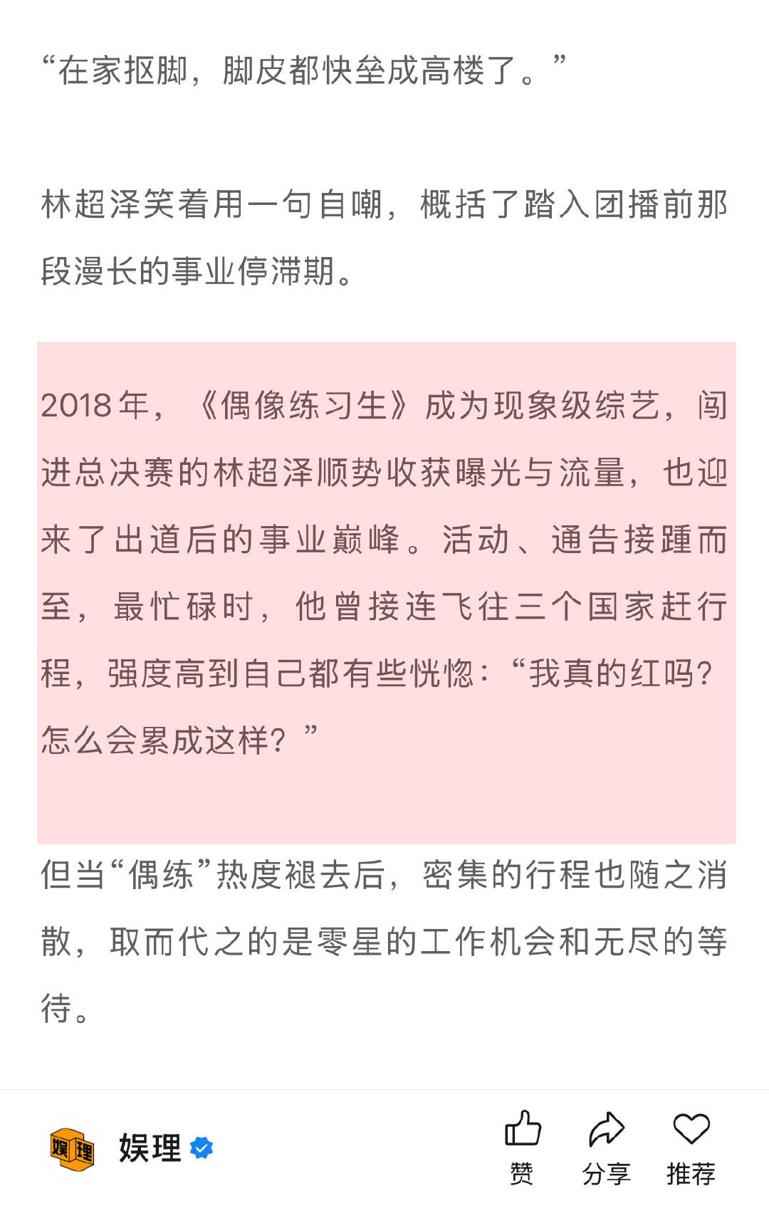 刘冠佑回应被说做团播可惜了 林超泽回应团播为了赚快钱 用"在家抠脚”的自嘲,概括了自己踏入团播前那段漫长的事业停滞期。2018年《偶像练习生》让他收获了曝光与流量。但当“偶练”热度褪去后,密集的行程也随之消散,取而代之的是零星的工作机会和无尽的等待。 刘冠佑林超泽谈爱豆做团播↓