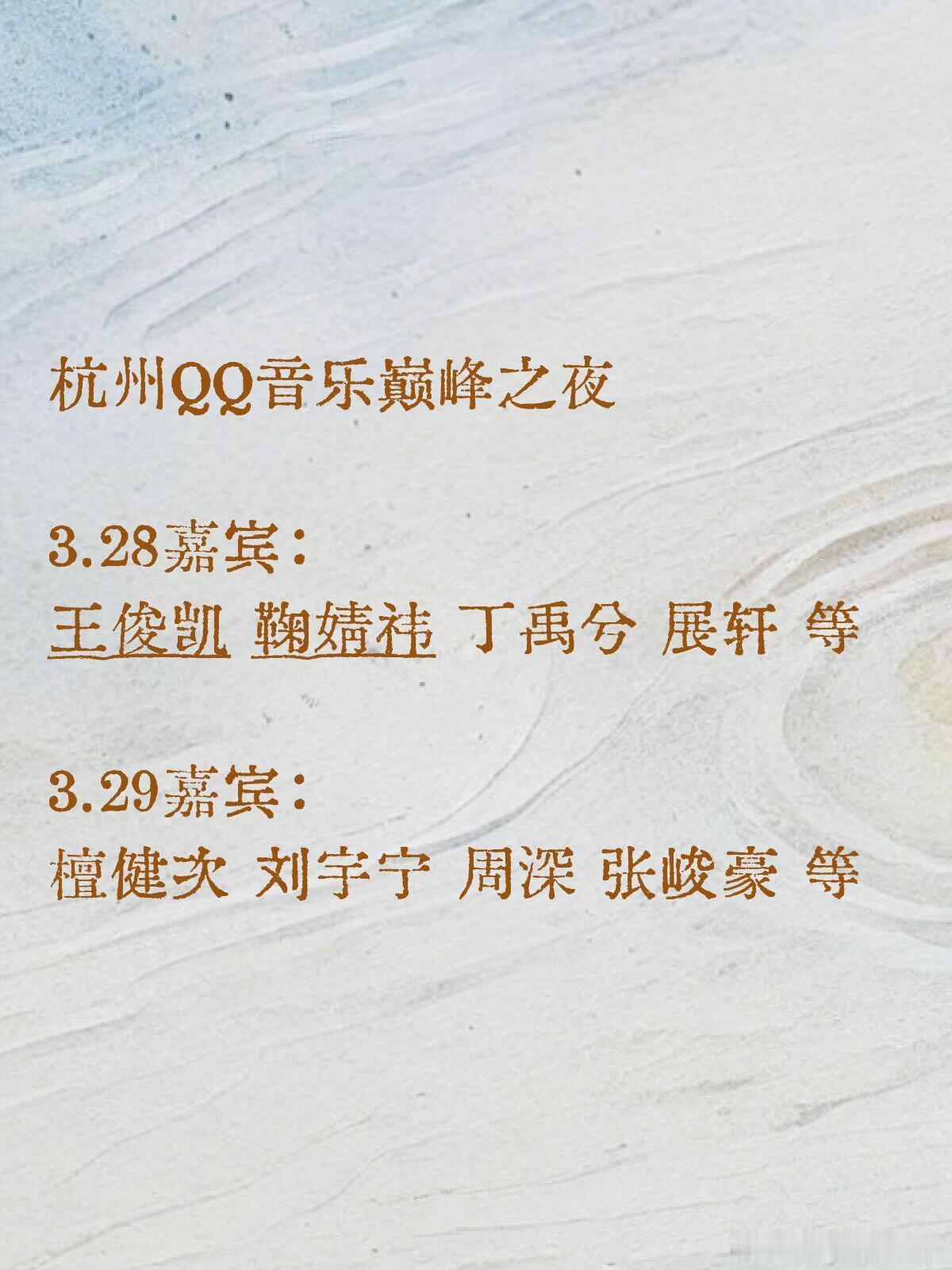 杭州QQ音乐巅峰之夜3.28嘉宾:王俊凯 鞠婧祎 丁禹兮 展轩 等3.29嘉宾:檀健次 刘宇宁 周深 张峻豪 等