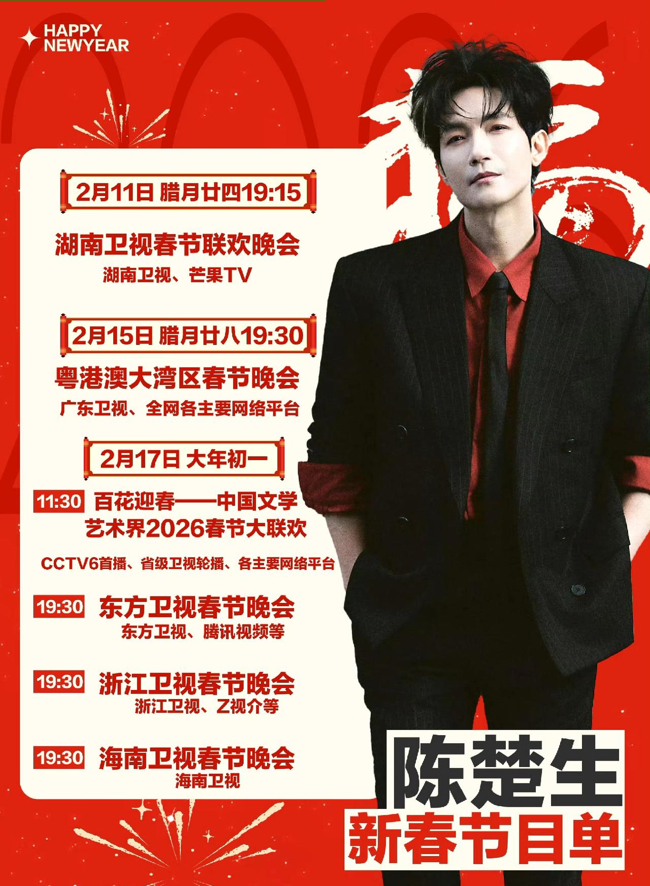 陈楚生春节期间各大晚会歌单, 浙江卫视两首连唱, 广东卫视粤语歌, 百花迎春必须