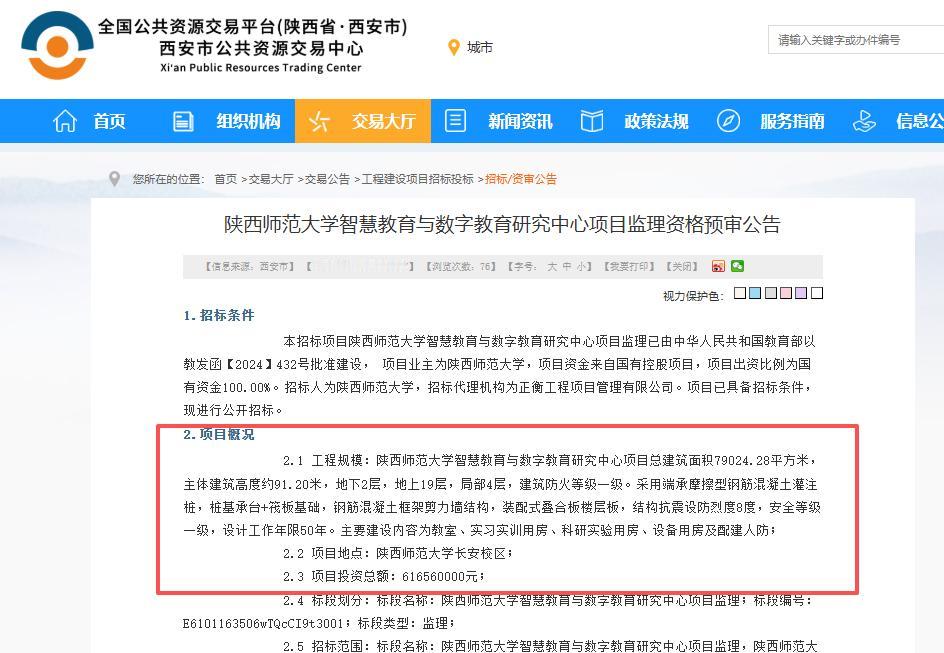 启动招标!总投资6.166亿元!西安一所”211“高校新建研究中心.... 日前,西安公共资源交易中心发布《陕西师范大学智慧教育与数字教育研究中心项目监理资格预审公告》,内容显示: 陕西师范大学智慧教育与数字教育研究中心项目位于陕西师范大学长安校区,项目投资总额6.1656亿元,总建筑面积79024.28平方米,主体建筑高度约91.20米,地下2层,地上19层,局部4层,主要建设内容为教室、实习实训用房、科研实验用房、设备用房及配建人防。 据悉,陕西师范大学位于古都西安,是国家“双一流”建设高校、“211工程”重点建设大学和“985工程”教师教育优势学科创新平台建设高校。学校前身是1944年成立的陕西省立师范专科学校,1954年更名为西安师范学院,1960年与陕西师范学院合并定名为陕西师范大学,1978年划归教育部直属。学校设有长安、雁塔两个校区,拥有27个学院(部)和1个基础实验教学中心,开设69个本科专业,是全国首批博士和硕士学位授予单位! 其中,长安校区是学校的主校区,位于陕西省西安市长安区西长安街620号,于2002年建成投入使用,校区占地约2800亩,本次启动招标的陕西师范大学智慧教育与数字教育研究中心项目,便是位于陕西师范大学长安校区东门内区域!