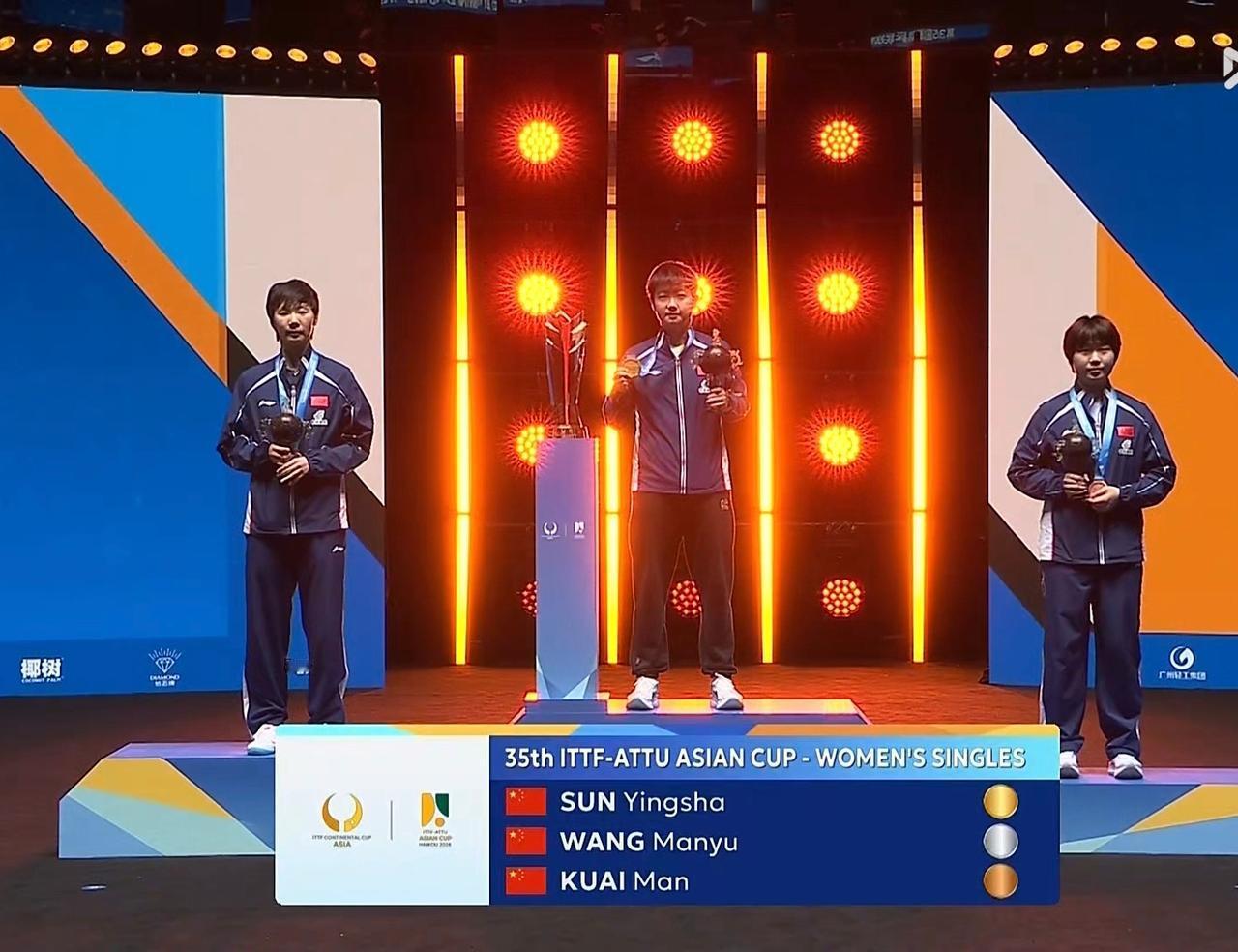 7局大战,孙颖莎4-3险胜王曼昱夺冠! 第35届国际乒联亚洲杯女单比赛全部结束,最终国乒包揽金银铜牌!恭喜恭喜! 女单铜牌赛中,蒯曼4比1战胜了日本张本美和夺得铜牌,蒯曼成长了! 女单决赛如愿在孙颖莎与王曼昱之间进行,经过一个多小时的鏖战,两人战满七局,最终孙颖莎以4比3险胜王曼昱夺冠,比赛相当激烈,场上没有败者,联手贡献了一场精彩绝伦的比赛! 恭喜