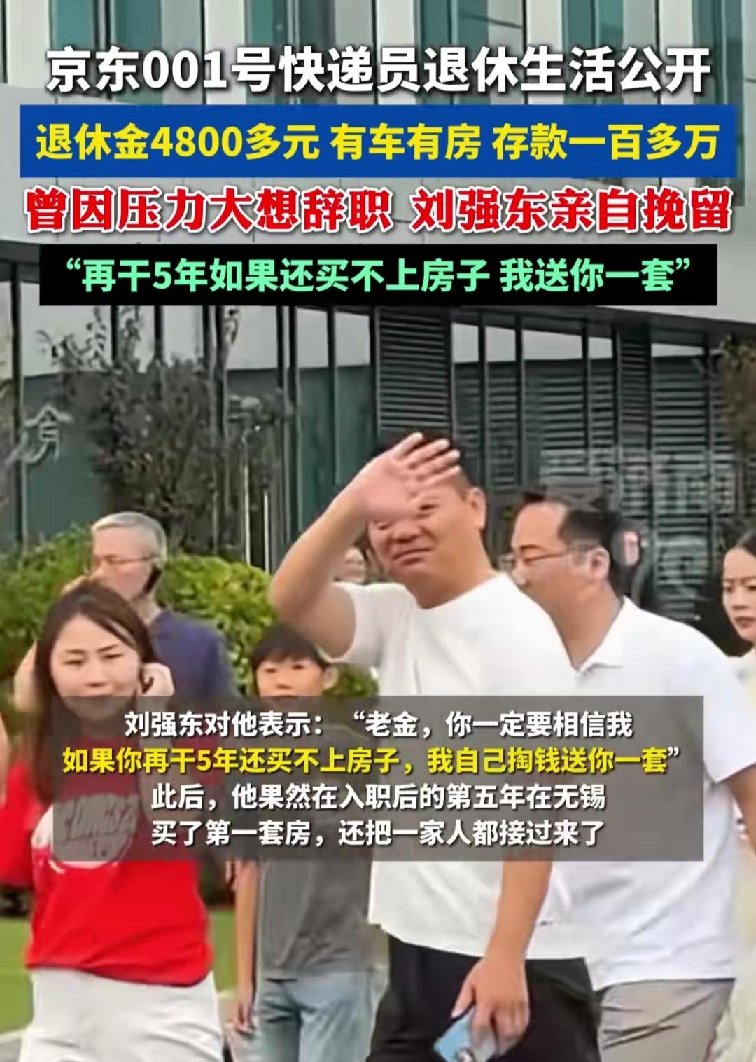 普通打工人熬到退休能活成啥样?无锡有个大叔最近把我看愣了——他是2009年京东在无锡招的第一个快递员,工牌带着“001”编号,干到60岁退休,现在日子稳得让人羡慕。 前阵子他自己晒退休生活:每月退休金4800多,在无锡有房有车,存款直接超百万。但你敢信?这人早年差点跑路!那时候快递活儿又累又熬人,他扛不住想辞职,结果刘强东亲自找他聊,还放话“再干5年买不上房,我送你一套”。 没等老板送,他入职第五年就自己在无锡买了房,把全家接过来扎根了。从扛不住压力想走,到十几年熬出安稳晚年,这一路的劲儿,好像把普通打工人的盼头都装进去了。你说这算不算是“熬对了”?