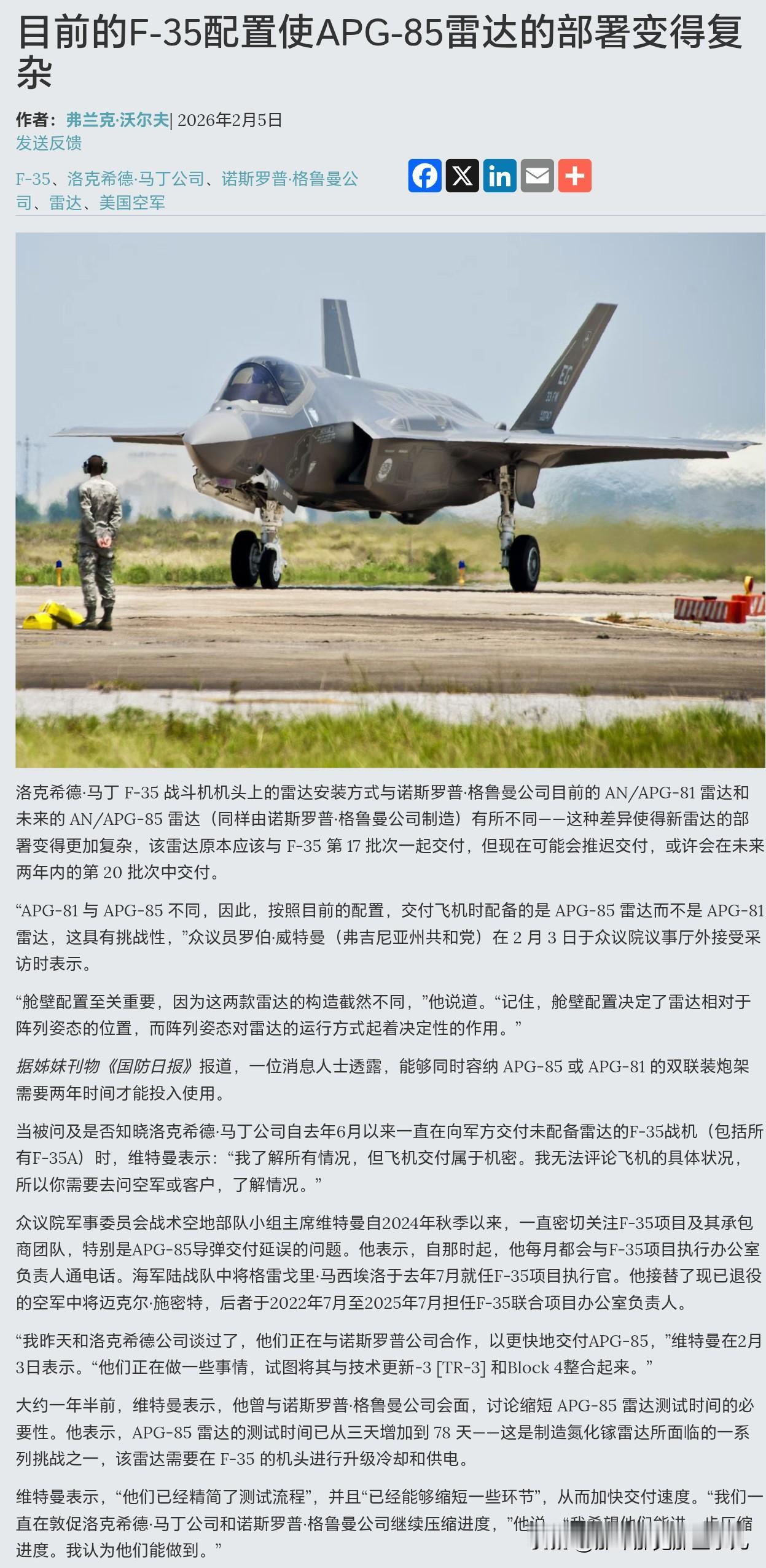 老美可能接收了一批没有雷达的F35... 哈哈哈,之前说25年交付的191架没软件,现在连雷达都没了吗?这事真魔幻里透着邪门,没装雷达的等同皇帝的新装,飞翔的古灰盒? 三哥有没装发动机的光辉MK-1A,西大有没装雷达的闪电F35,确实卧龙凤雏了~~ 东海上空 老中:雷达干扰装置失效了!牢美什么黑科技.. 老美:嘿嘿嘿配重片,用朴素的思路破解高端的战法..