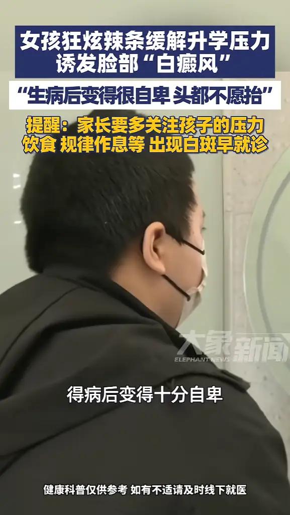 2月6日,河南郑州,一初三女生因为升学压力大,便经常靠吃辣条缓解压力,没想到诱发了脸部白癜风,看着脸上冒出的白斑,女孩十分自卑,怕同学嘲笑,连头都不愿抬,话也变得非常少。 这起事件令人十分痛心,也再次敲响了家长和社会的警钟。初三学生正处于升学压力最大的阶段,心理健康和生活习惯的管理尤为重要,却常被忽视。 【事件概述】 河南郑州的一名初三女生因应对升学压力,频繁食用辣条缓解焦虑,不料引发白癜风,脸上出现白斑,逐渐变得自卑、不愿与人交流。最终诊断为白癜风,医生指出其与长期焦虑、不规律饮食和辛辣刺激食物摄入有关。 【原因分析】 升学压力大:青少年在升学关键期,焦虑情绪普遍存在。 不良饮食习惯:以辣条等刺激性食物取代正常餐食,影响身体健康。 心理调适不足:缺乏有效的减压方式,依赖不健康的发泄途径。 【反思与建议】 关注心理健康:家长、老师应留意孩子的情绪变化,及时沟通,提供心理支持。 科学减压:培养健康的压力调适方法,如运动、兴趣培养、与朋友交流等。 合理饮食:引导孩子养成清淡、规律的饮食习惯,避免过多摄入辛辣刺激食品。 规律作息:确保充足睡眠和合理作息,有助于身体和心理的健康发展。 专业帮助:必要时寻求心理咨询,帮助孩子正确应对升学压力。 【总结】 青少年的成长不仅仅是学业成绩,更关乎心理健康和生活习惯的养成。家庭和学校应共同努力,为孩子营造一个健康、支持的成长环境,帮助他们以积极、健康的心态迎接未来的挑战。