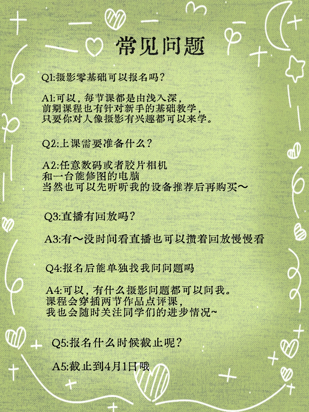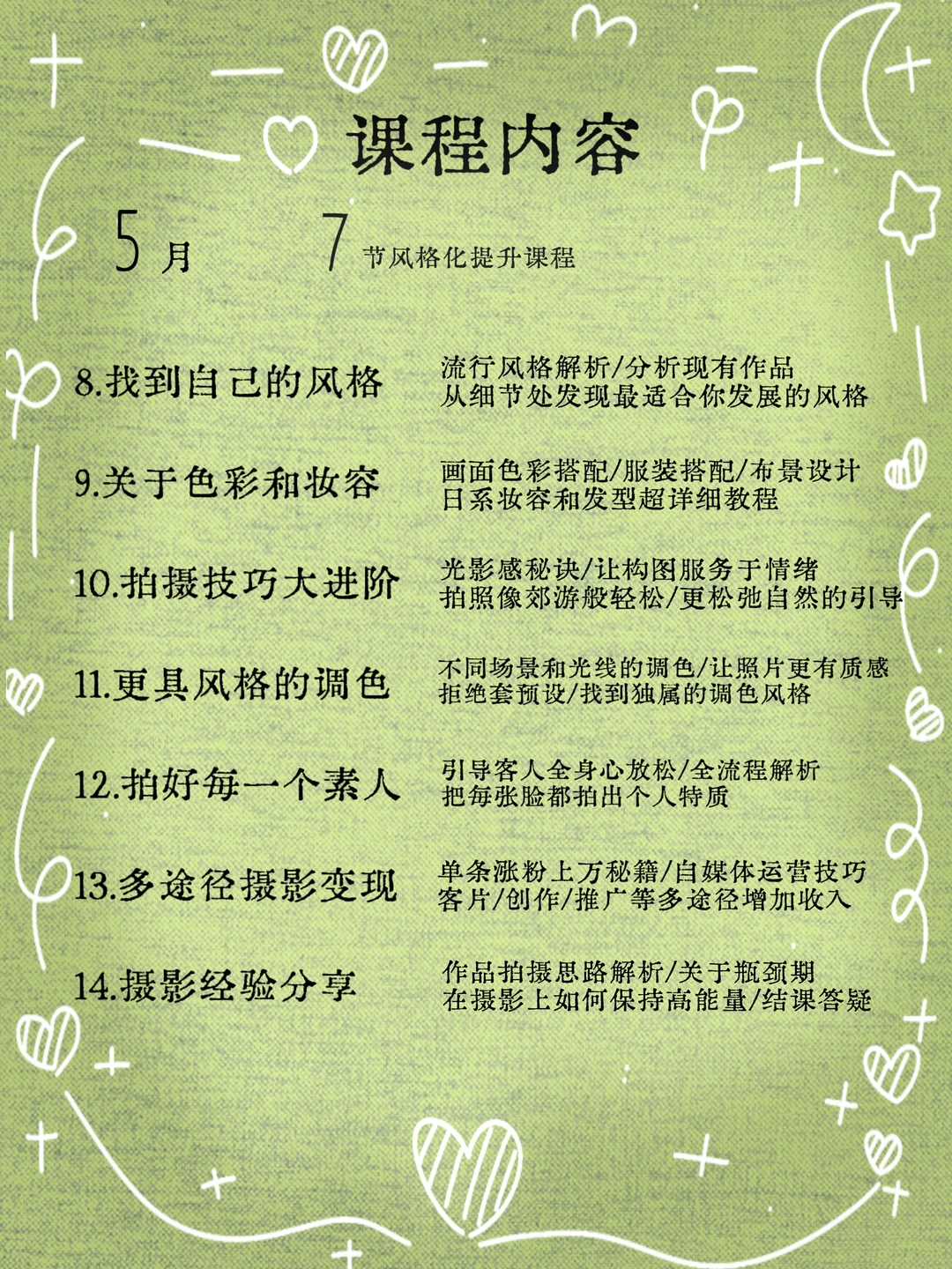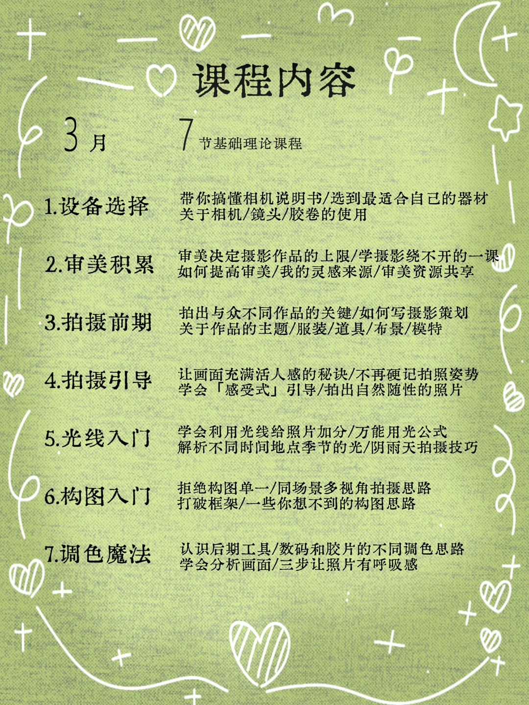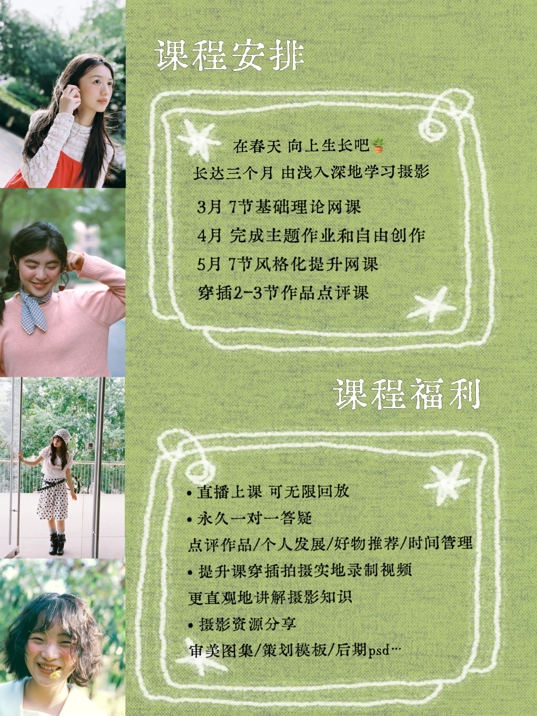 看到一期课程的学生们都慢慢拍出了自己的风格 于是,我的第二期摄影网课来啦🐾 去年,花了一年时间形成风格,在无数次按下快门的瞬间探寻拍照的意义。 图上是思考了很久的课程安排,留了一个月时间给大家创作,让理论的内容在春天生根发芽,五月后一定大有收获! 这次课程比往期增加了很多风格化的内容。不管是网课还是面授,我都会说,不希望学生成为下一个我,希望她们能找到属于的拍摄节奏,成为一个有个人特色的摄影师🐿️