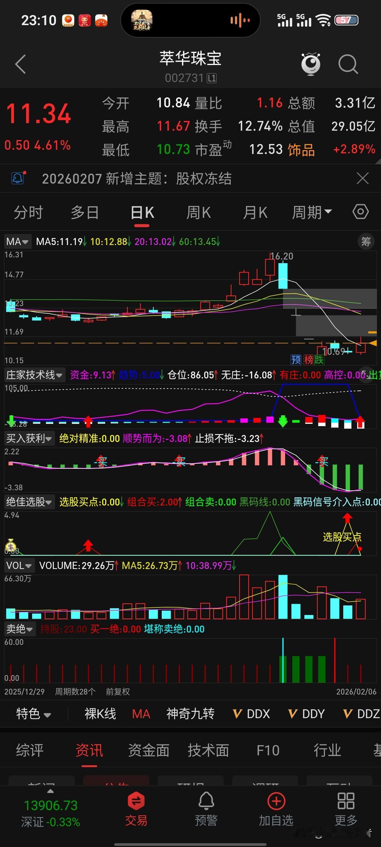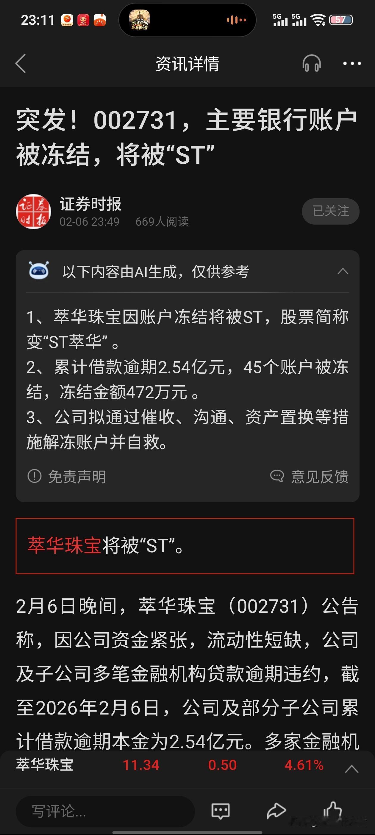 周五涨4.6%骗你上车,周一直接ST!萃华珠宝这波“坑”太狠了 周五(2月6日)收盘,萃华珠宝(002731)还涨了4.6%,收在11.34元,成交3.3亿,换手12.7%,看着挺热闹。结果当晚公告一出来:公司2.54亿借款逾期,45个银行账户被法院冻结,2月9日停牌一天,10日复牌直接戴帽“ST萃华”,涨跌幅限5%。 说白了就是:钱还不上、账户被冻、经营快转不动了,交易所给你贴个“ST”标签——高风险警告。周五冲进去的人,周一开盘一看名字变“ST”,想跑都只能每天±5%慢慢磨,这节奏跟“关门打狗”差不多。 更扎心的是:公司短期借款17亿多,货币资金才4亿出头,现金流早就绷不住了,这次逾期、冻结不是突然爆雷,是早就埋好的雷。周五那根阳线,更像是消息出来前“最后的狂欢”,谁追谁接盘。 “ST股不是赌场,是火场。周五涨得再欢,也别把反弹当反转——账户是自己的,雷是公司的。” (不构成投资建议,纯吐槽+提醒风险) 萃华珠宝 今日A股 A股市场 ST股 炒股的那些事