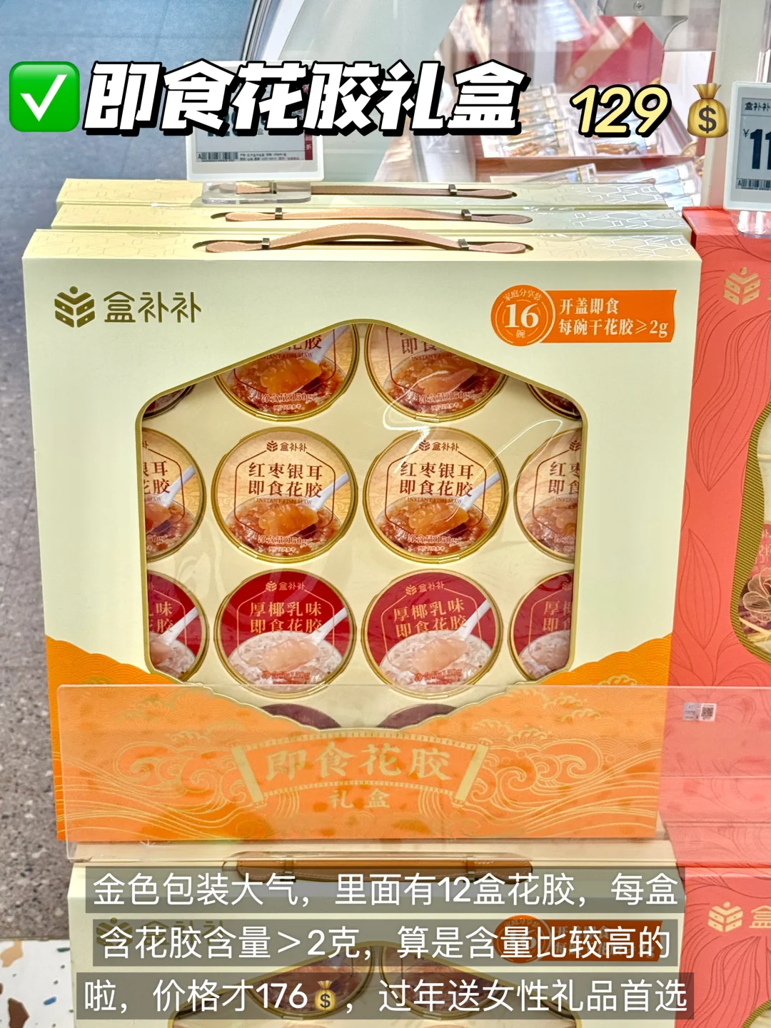 金色包装大气,里面有12盒花胶,每盒含花胶含量>2克。算是含量比较高的啦,价格才176💰,过年送女性礼品首选