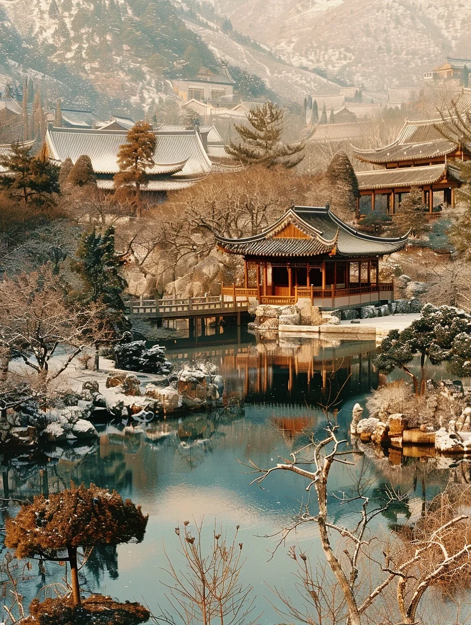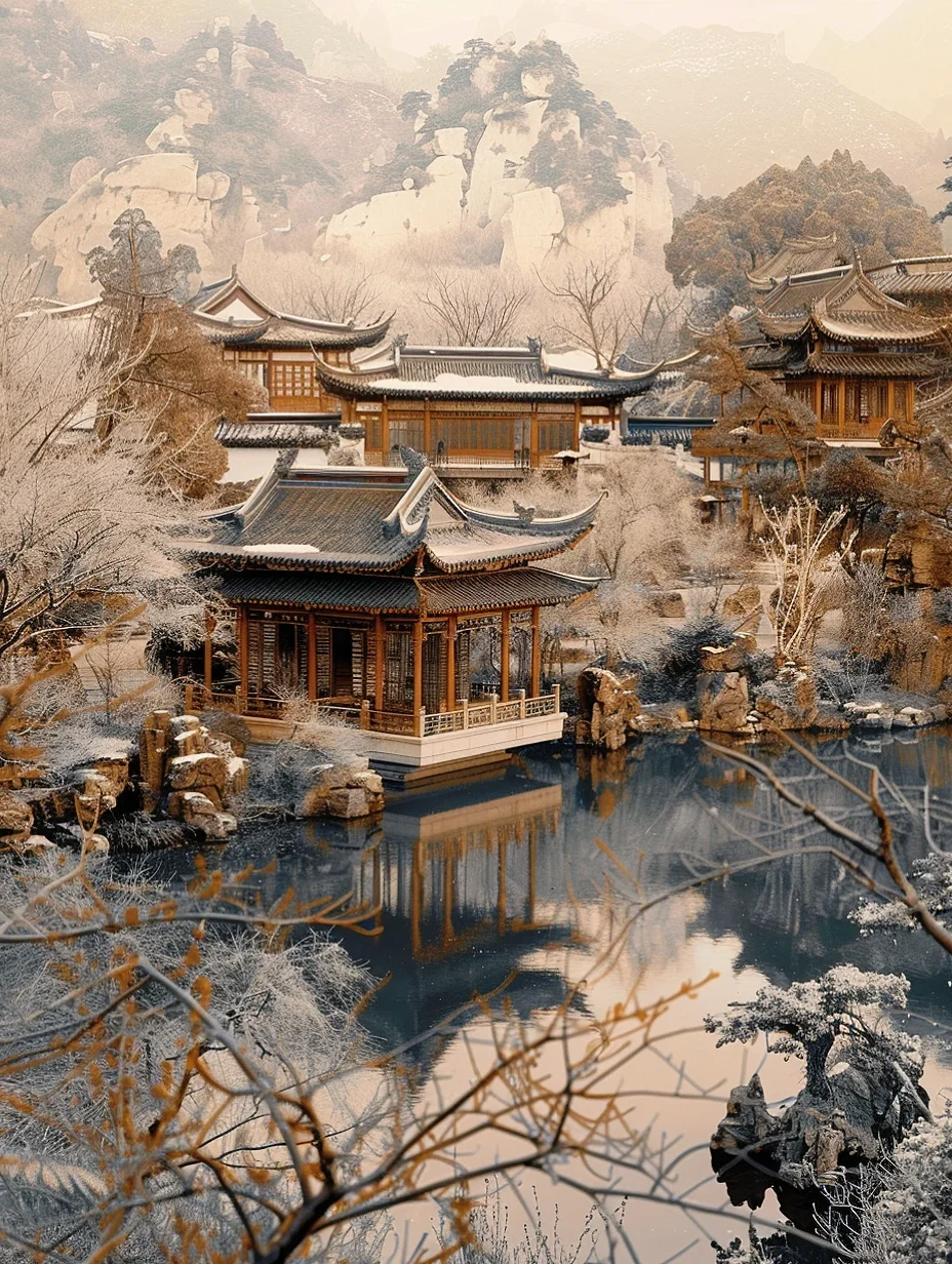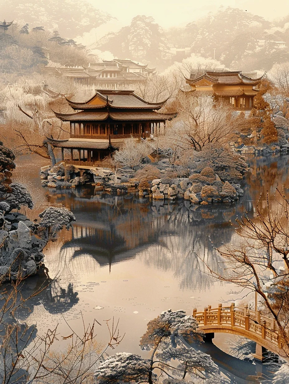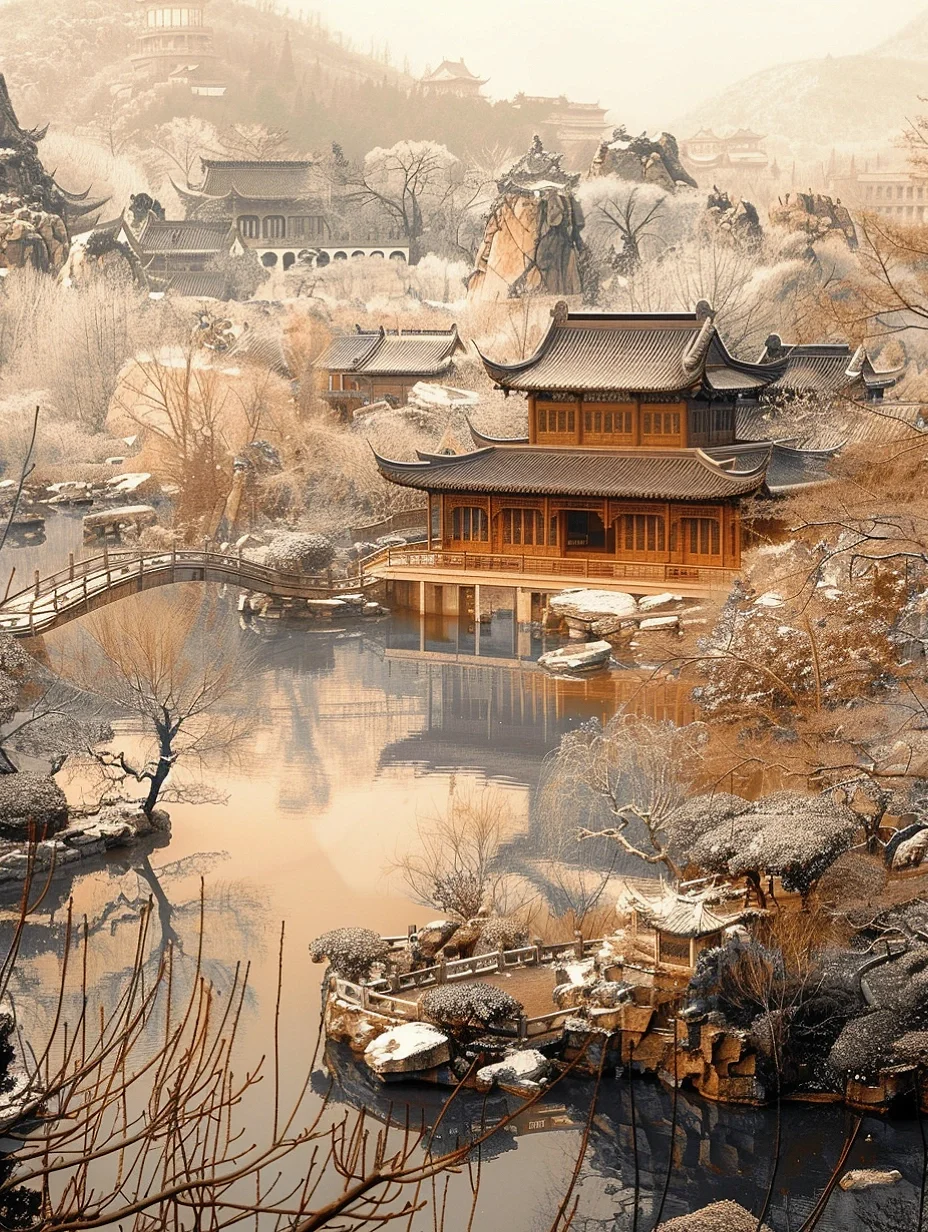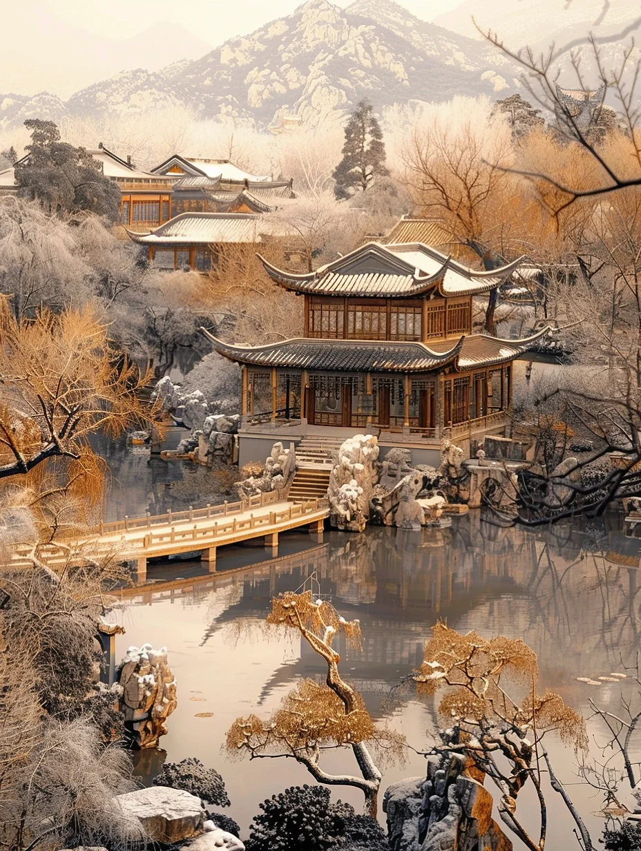 【中式大美雪景】雪后园林,水边楼阁美如画