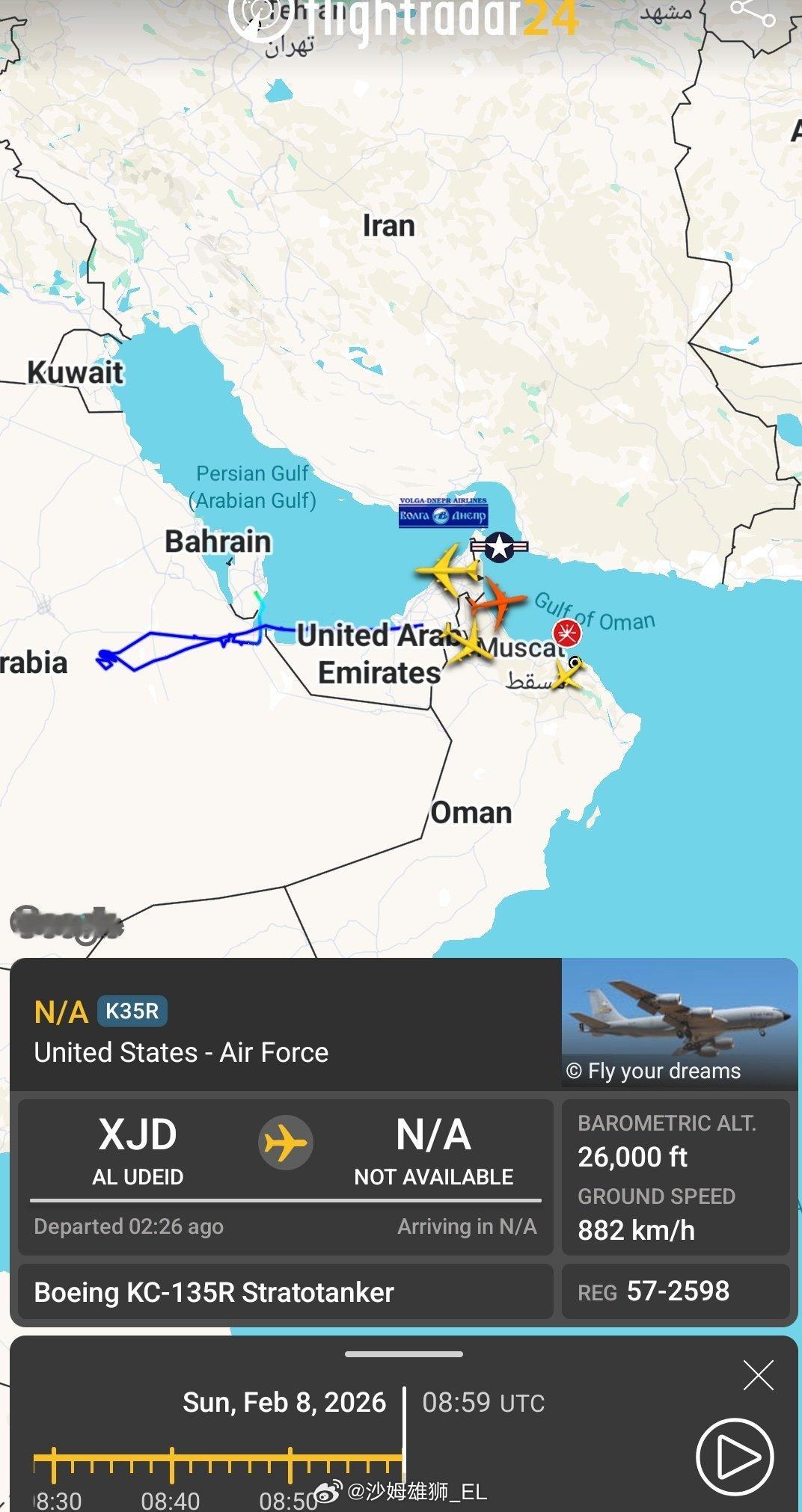 3、一架KC-135R加油机正在海湾为“亚伯拉罕·林肯”号航空母舰上的F-35和F-18战斗机进行空中加油,这应该是潜在行动前的某种训练。