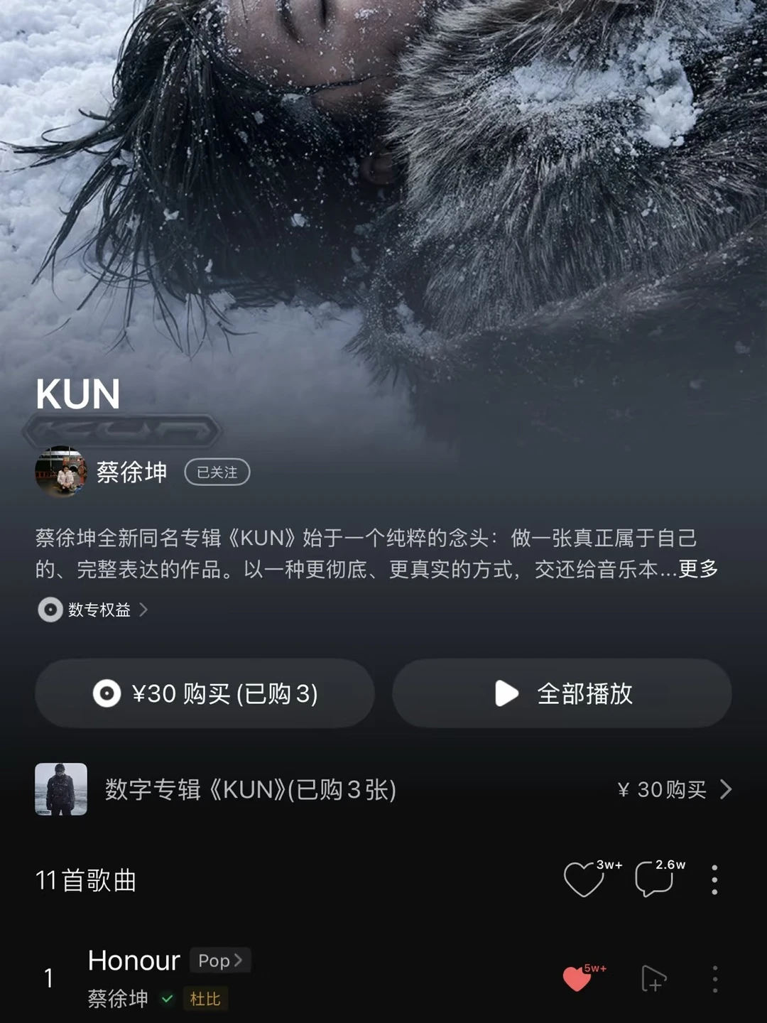 还记得之前蔡徐坤扮路人 街头随机放歌的名场面吗 真爱粉一听秒认,路人听完也疯狂夸好听 现在他的全新数字专辑《KUN》终于来了! 第一时间冲了全专,还是熟悉的坤式旋律,每一首都戳中审美💯 ikun们都听了吗? 快来评论区聊聊最爱哪首~