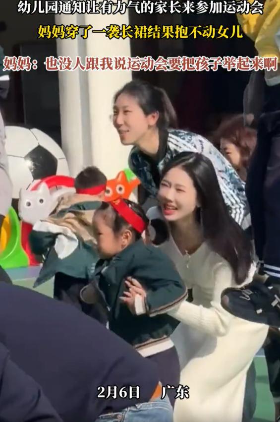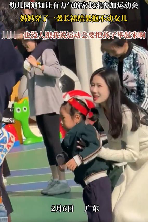 太尴尬了!广东,一女子去参加女儿幼儿园举办的亲子运动会,来之前幼儿园说要家里力气大的家长来,女子压根没多想,可到了现场才知道要把孩子举起来,结果全场就只有她抱不起来,只能捂着嘴原地尬笑。 前往活动前,幼儿园老师于家长群发布通知,特意嘱咐让家中身强力壮的家长参与,这位宝妈彼时未深思,以为不过是一场寻常的亲子游戏罢了,陪孩子玩一玩、凑个热闹就行,也没特意换衣服,就穿了条平时穿的长裙,踩了双拖鞋随便收拾一下就带着女儿去了幼儿园。 到了幼儿园操场人已经很多了,都是来参加活动的家长和孩子,氛围确实很热闹,等老师宣布下一个环节的时候,这位宝妈彻底懵了,原来所谓的亲子游戏,是要家长把孩子高高举过头顶,还要跟着音乐的节奏晃动,有的家长还会抱着孩子转几圈,让孩子体验飞高高 的感觉。 看着周围的家长一个个行动起来,她也赶紧蹲下身,想把女儿抱起来,跟上大家的节奏。可第一次使劲,女儿纹丝不动;她咬了咬牙,又试了一次,脸憋得通红,胳膊也酸得发抖,浑身都在使劲,可孩子还是没被抱起来一点。 那一刻她彻底慌了,周围全是家长们的笑声和孩子们的欢呼声,还有音乐的声音,可她却觉得周围的一切都很吵,又很安静,那种反差感让她浑身不自在,全场那么多家长,好像就只有她一个人抱不起来自己的孩子,那种窘迫感一下子涌了上来,她只能赶紧站起来,双手死死捂着嘴,在原地尴尬地笑着。 其实那笑声里根本没有一点开心的成分,全是用来掩饰自己尴尬的,她不敢抬头看周围的人,生怕看到别人异样的目光,也不敢看自己的女儿,心里又急又愧。她穿的长裙此刻显得格外累赘,迈不开步子,也用不上劲,脚上的拖鞋更是不方便,站在原地,连动一下都觉得不自在。 她能感觉到,身边的低气压让人窒息,和周围热闹的氛围格格不入,本来以为就是一场轻松的亲子互动,没想到最后变成了自己的“社死现场”,那几分钟,她觉得比一整天都漫长,恨不得找个地缝钻进去,赶紧逃离这个地方。 更让她难受的是身边的女儿,来之前女儿一直很期待,一路上都在念叨着要和妈妈一起玩,要飞高高,脸上满是开心的笑容,可现在女儿只能安安静静地站在她身边,看着别的小朋友被爸爸妈妈举得高高的,笑得无忧无虑,她脸上的期待一点点消失,笑容也冷却了下来,最后只剩下一脸的不知所措,低着头,不说话,也不看周围的一切。 那一刻,这位宝妈心里又尴尬又愧疚,她知道自己让女儿失望了,其实她并不是不爱女儿,平时家里带娃大多是家里的老人或者孩子爸爸帮忙,她平时上班也比较忙,力气本身就不大,平时抱孩子也都是短时间抱着,从来没试过要把孩子举过头顶,更没想到幼儿园的亲子活动会有这样的环节。 那天的亲子运动会,别人都是开开心心的,只有她,全程都在尴尬中度过,直到活动结束,她都没敢和其他家长多说一句话,匆匆带着女儿离开了。其实亲子运动会的初衷,本来就是为了让家长和孩子多一些互动,感受陪伴的快乐,而不是为了比拼家长的体力,更不是让哪个家长出丑。 现在想想,那种尴尬真的让人难忘,也希望以后幼儿园再办这种活动,能把通知说得明白一点,别再让这种让人窘迫的事情发生,毕竟,陪孩子开心成长,才是最重要的。