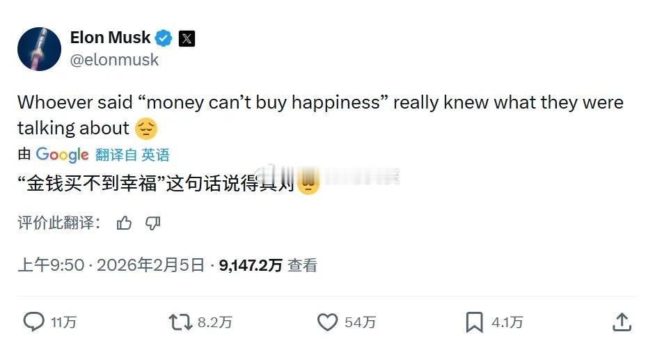 马斯克发文表示“钱买不到幸福”,在外网引发广泛关注。对于这个观点,你怎么看?埃隆·马斯克马斯克幸福