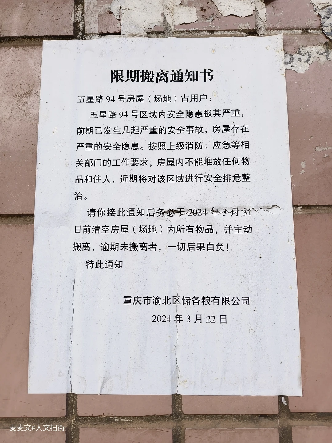 老粮仓斑驳墙面上的公司牌匾、2024年3月的限期搬离通知,都在诉说着它的变迁。对几代两路居民来说,这里是凭粮票换米面油的地方,是计划经济时代最踏实的生活印记。