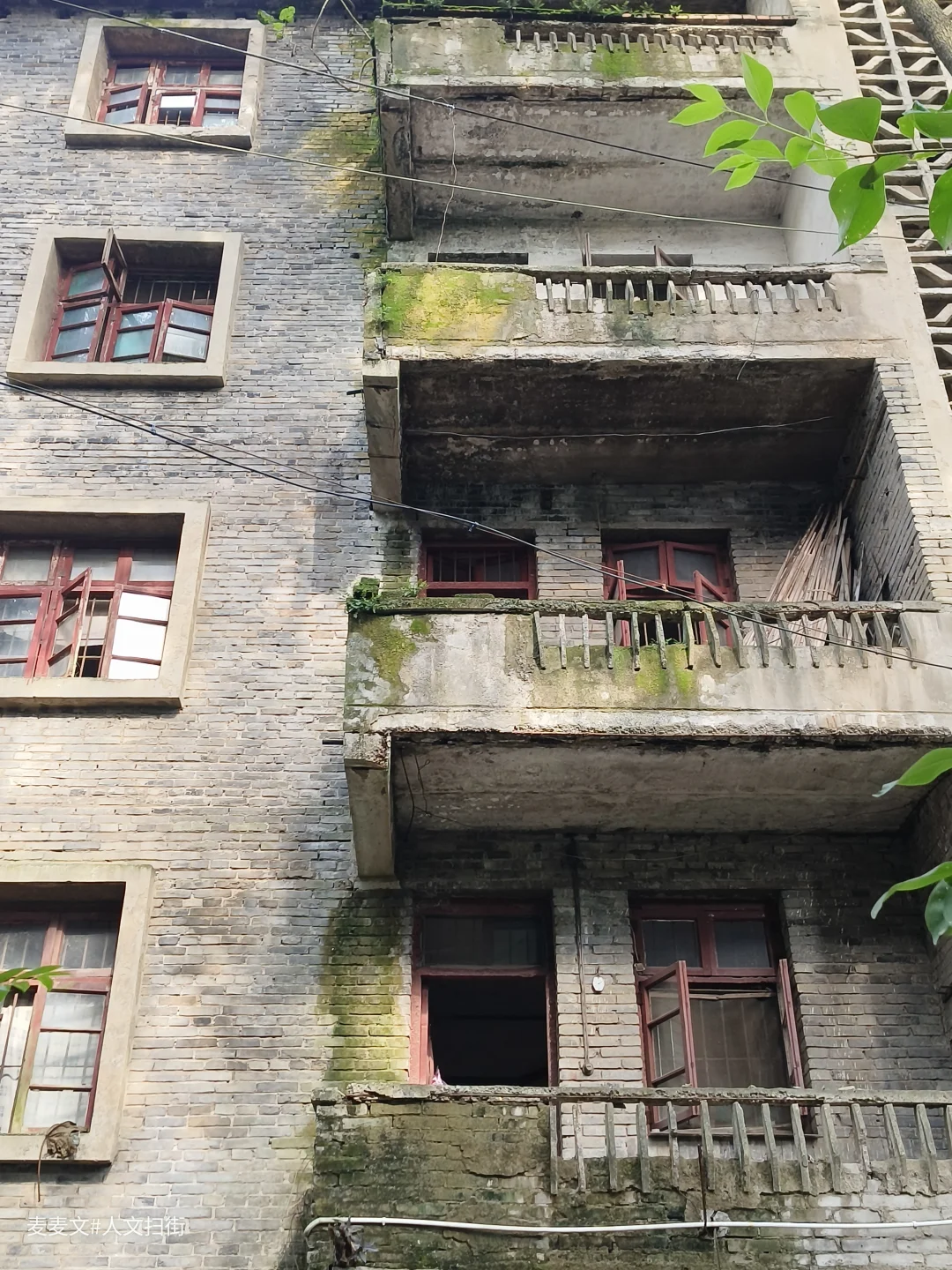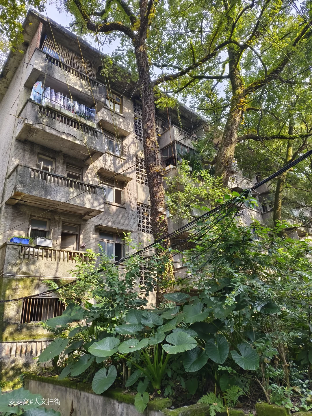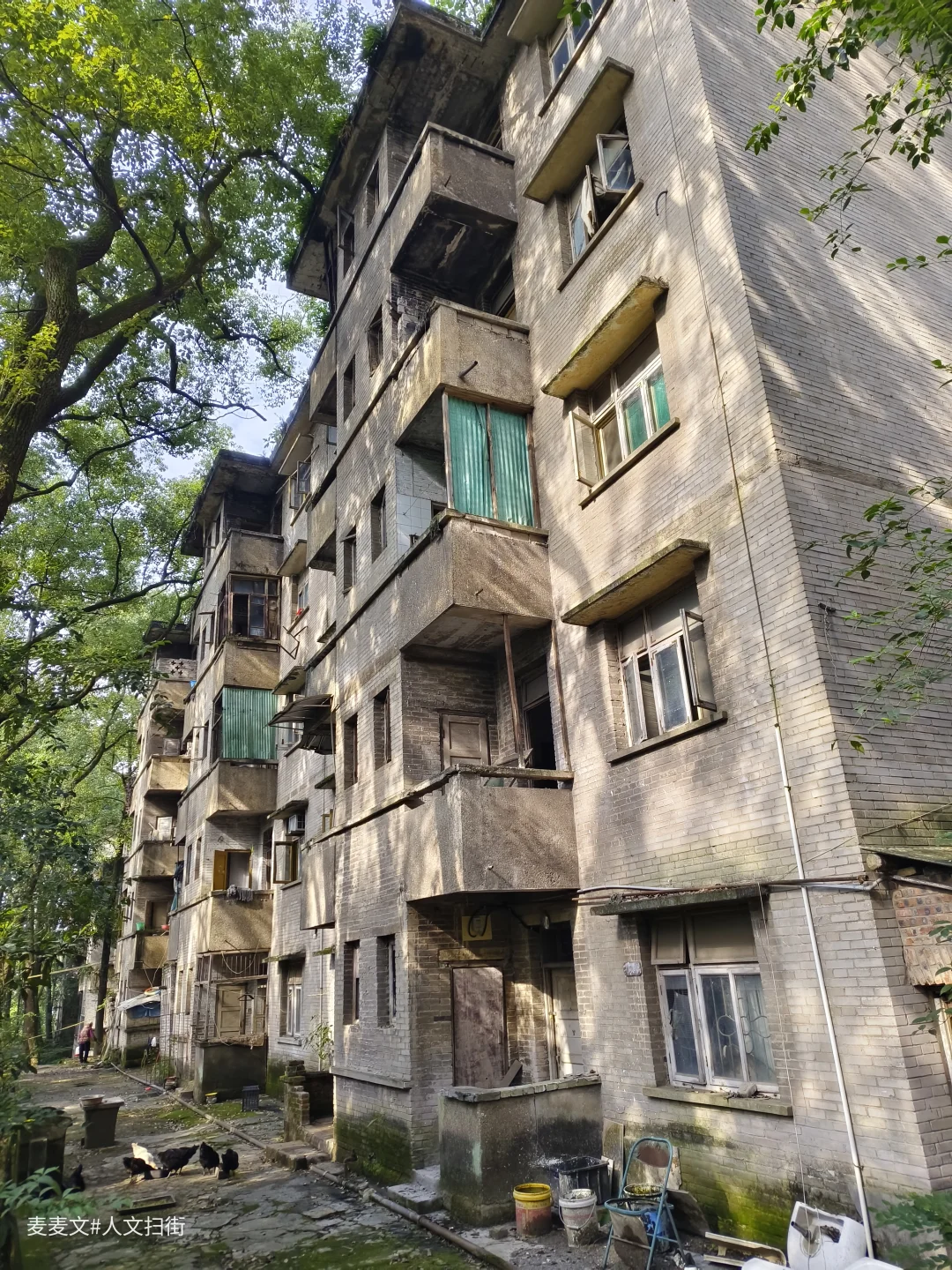 沿着重庆北碚西山坪的盘山公路往深处走,在浓荫蔽日的香樟树下,藏着一片老家属院。红砖灰墙的楼房依山而建,水泥花格窗爬满青苔,风化的栏杆上还留着当年的纹路。有的门窗已经用木板封死,墙面上模糊的“小卖部”粉笔字,和墙角那只粉色塑料桶,还在诉说着往日的烟火气。