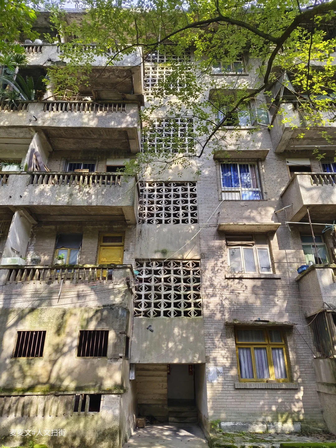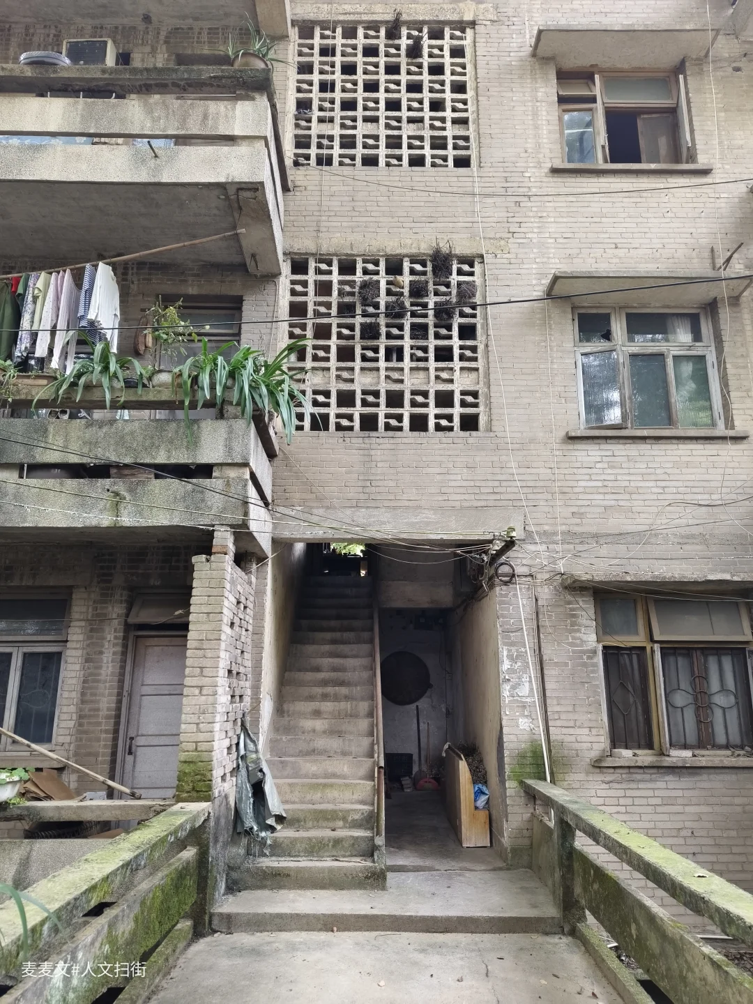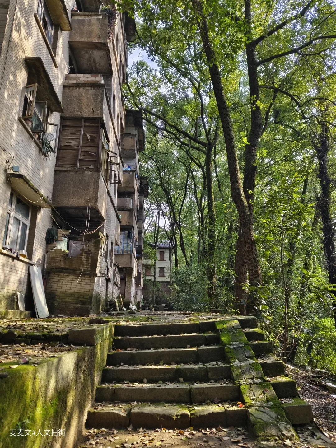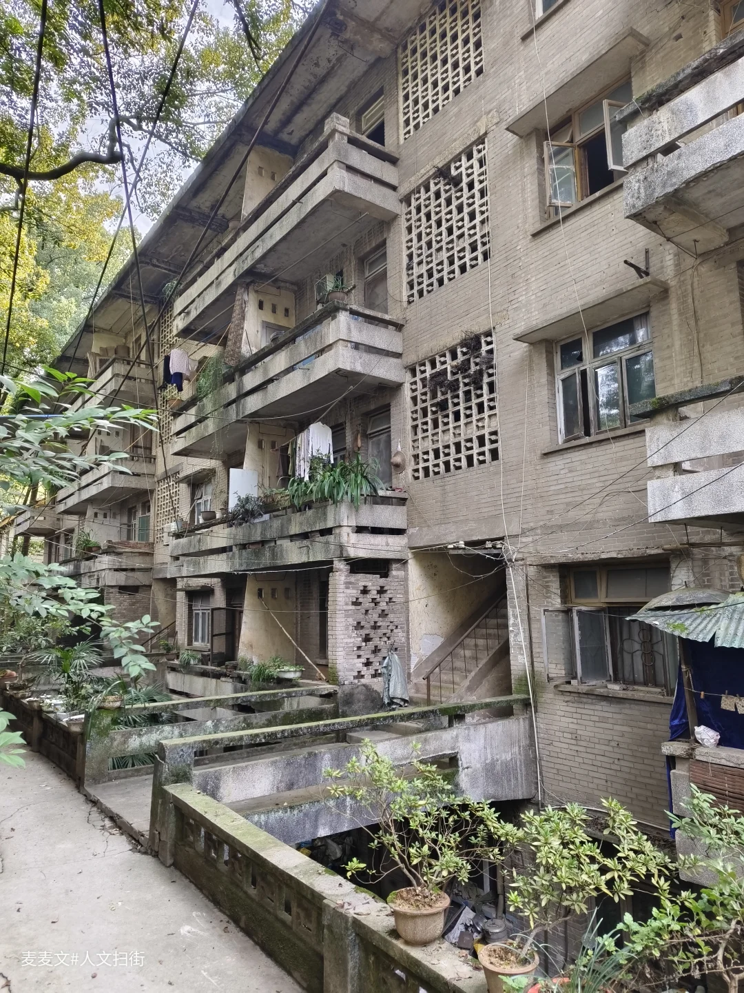 沿着重庆北碚西山坪的盘山公路往深处走,在浓荫蔽日的香樟树下,藏着一片老家属院。红砖灰墙的楼房依山而建,水泥花格窗爬满青苔,风化的栏杆上还留着当年的纹路。有的门窗已经用木板封死,墙面上模糊的“小卖部”粉笔字,和墙角那只粉色塑料桶,还在诉说着往日的烟火气。