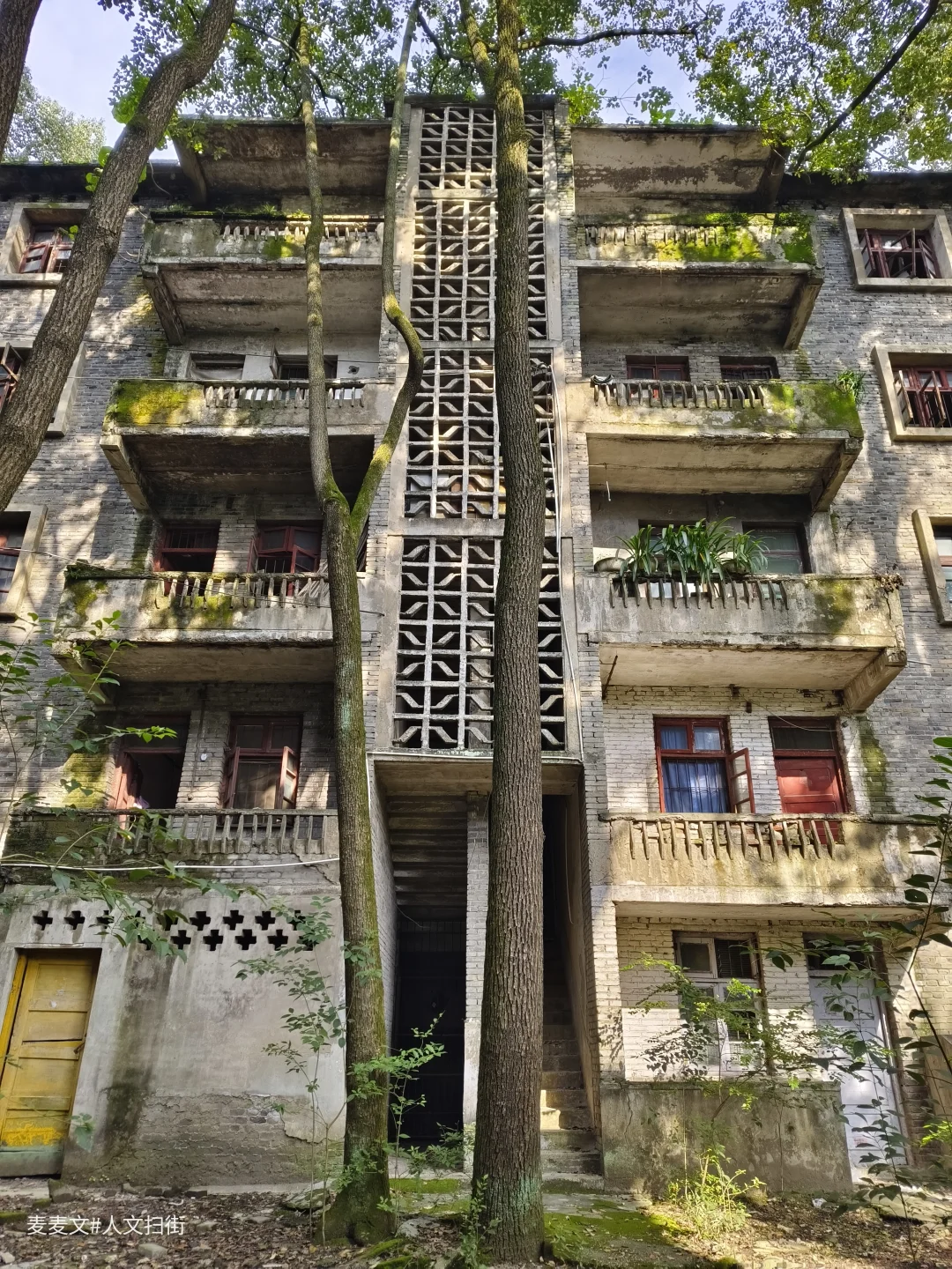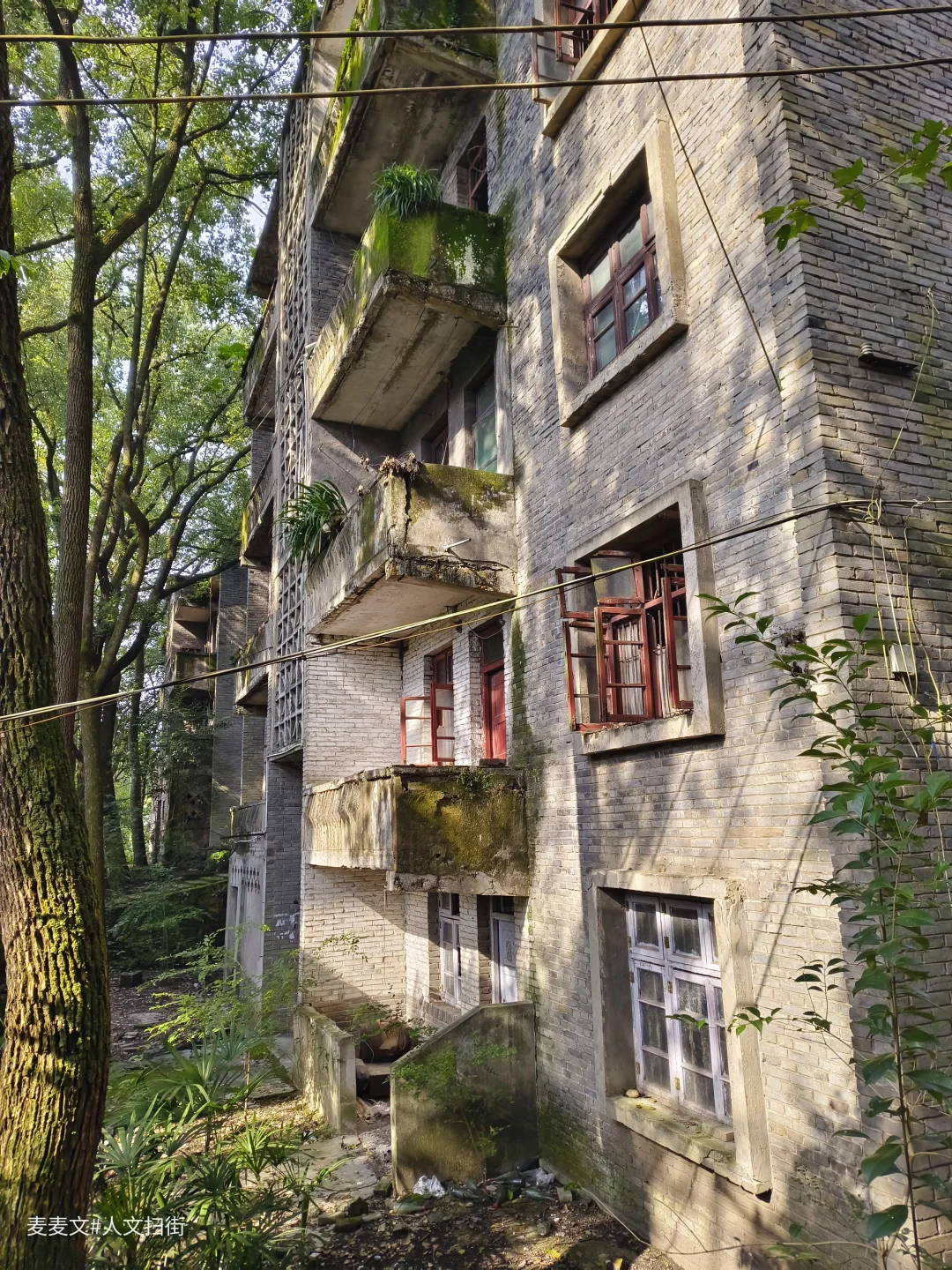 偶尔有老人端着铝锅从楼梯间探出身,门上的春联在斑驳的墙面上格外鲜亮,提醒着这里仍有人在生活。更多的楼栋则被草木侵占,藤蔓顺着砖缝钻进空荡的房间,只剩风穿过走廊时的呜咽声。据说这里曾是西山坪老教所配套的生活区,如今大半闲置,只有林间的鸟鸣和墙上褪色的通知,还在和访客们交换着关于时间的秘密。