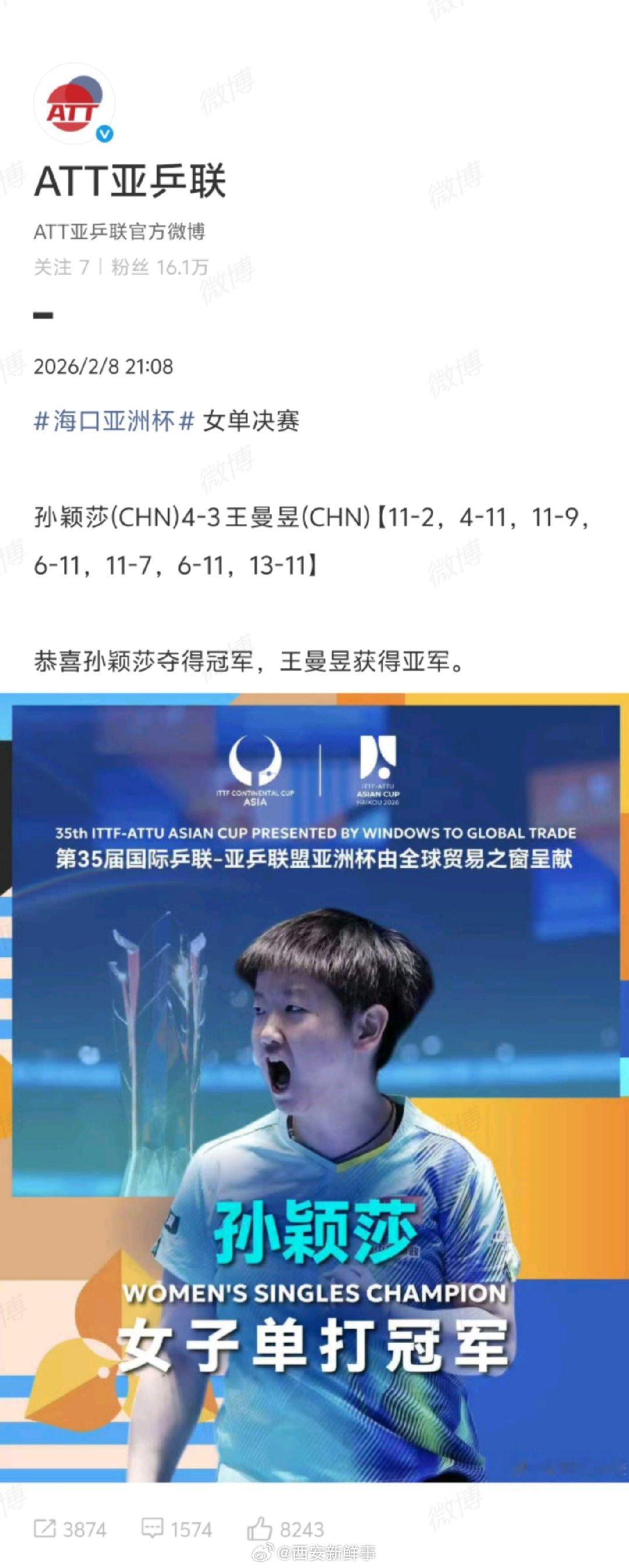 【亚乒联恭喜孙颖莎首夺亚洲杯女单冠军】亚乒联恭喜孙颖莎夺得冠军2月8日,海口亚洲杯女单决赛,4-3战胜,夺得亚洲杯女单冠军。