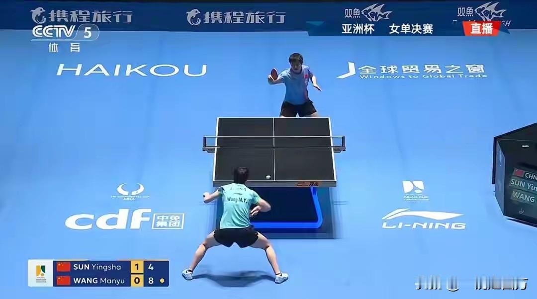 在海口进行的亚洲杯乒乓球赛女单决赛,对阵双方同去年一样,仍然是孙颖莎和王曼昱,不过结局和去年不同,去年王曼昱击败孙颖莎夺冠,而这次,两人经过七局大战,前六局孙颖莎以11-2、4-11、11-9、6-11、11-7、6-11与王曼昱战平后,决胜局以13-11险胜,收获本届赛事的女单冠军。之前结束的铜牌战,蒯曼以4-1战胜张本美和,让中国队包揽了本次比赛的女单前三名。