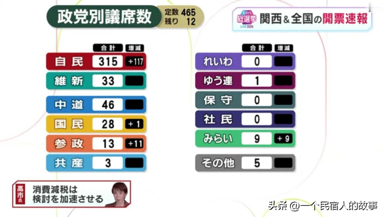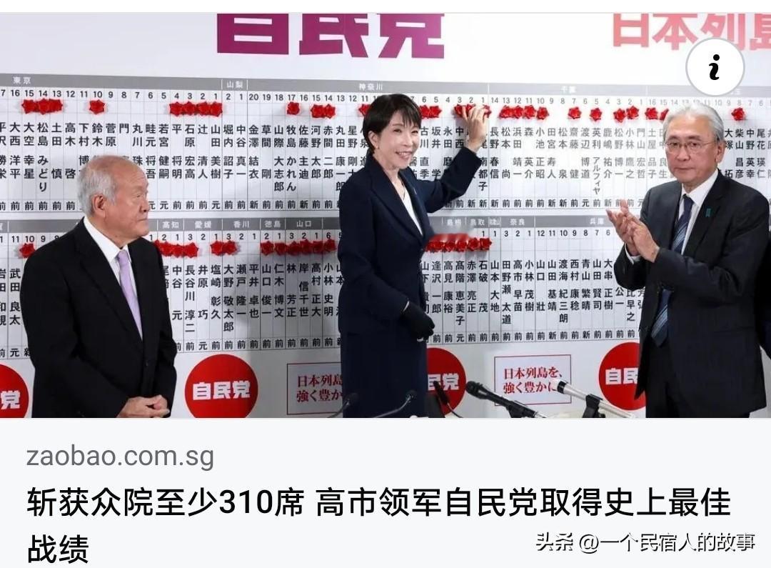 日本选举自民党已获315席!高市早苗带领自民党获创党以来最佳选举战绩! 截止北京时间2月9日凌晨2点,根据日本选举机构公布的最新实时开票结果,执政的自民党已单独获得315席,独自赢得超过三分之二席位,可单独修宪!不用看盟友维新会的脸色!高市早苗带领自民党创造了该党成立几十年来最好的选举战绩!在日本可谓封神了。