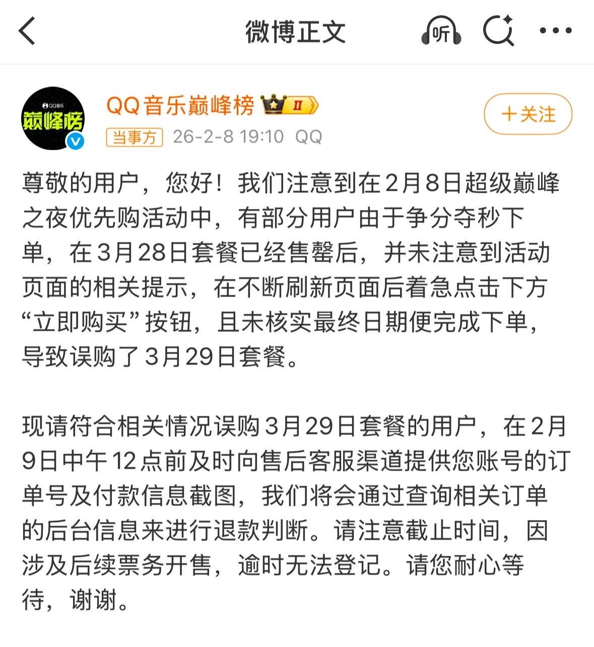 QQ音乐巅峰榜将退款误购套餐为什么那么多人买错啊?看到好几千人在等待退款。一般来说,购票系统是把日期放在最前面啊,提交的时候也能再次看到。很多买28号的变成了29,买29号的变成28了,还好只是没有正式开售……