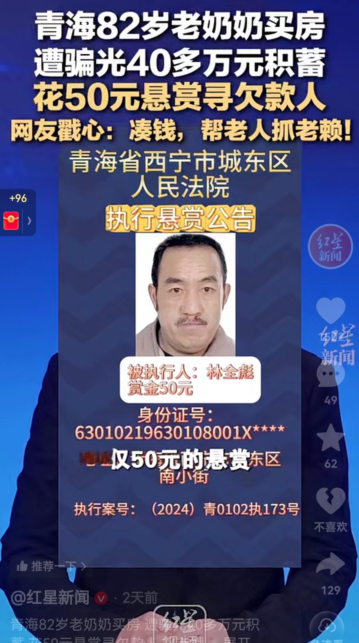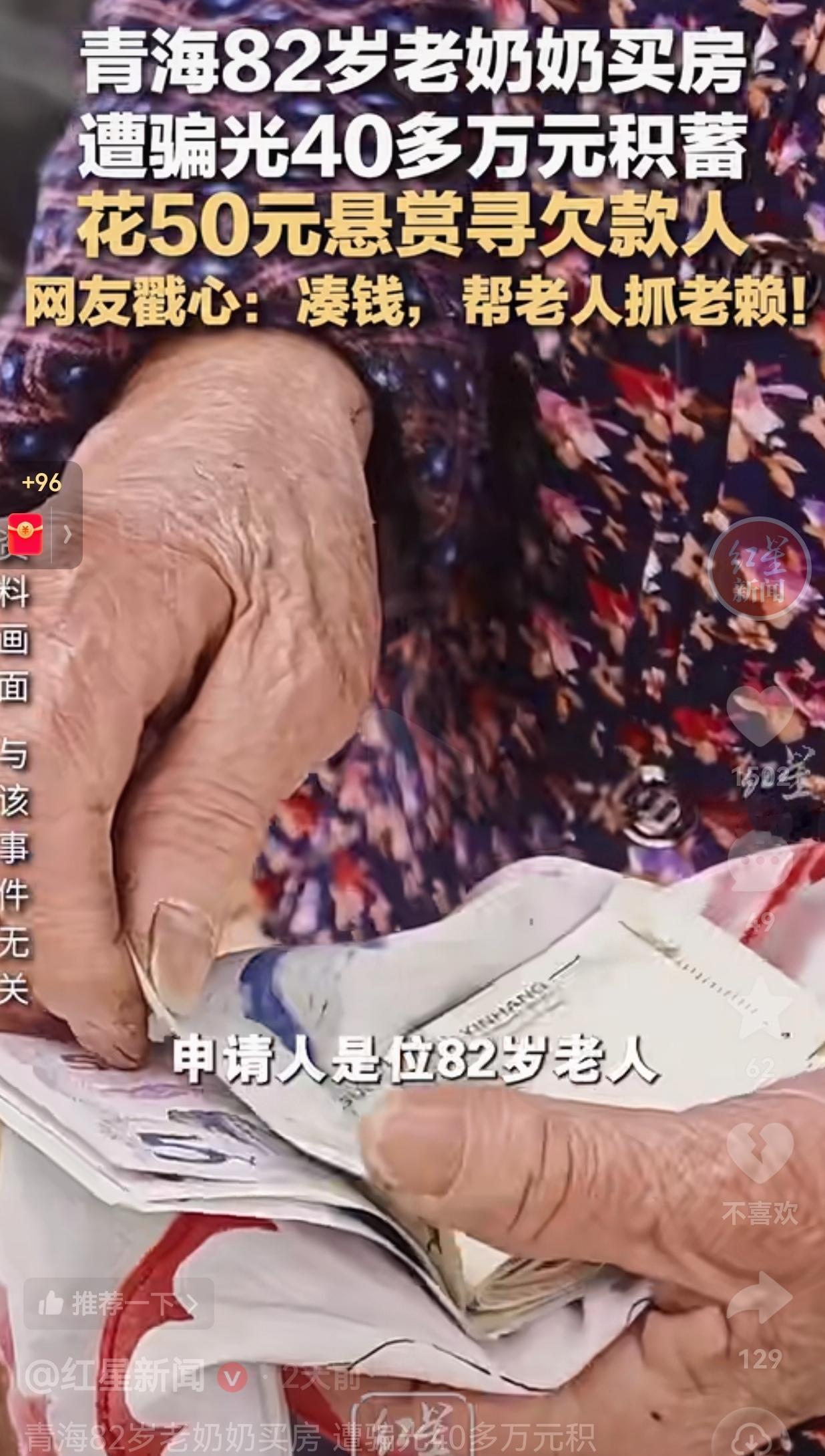 花50元悬赏全网寻人,被网友嘲讽没有诚意,当网友知道是一位82岁的老人被骗后,网友集体破防:我们凑钱帮她抓老赖! 青海一位82岁的老奶奶,一辈子省吃俭用攒下40多万养老钱,就想晚年能有个安稳的窝,结果买房遇到了骗子。 她交了39万房款后才发现,对方根本不是房主,房子根本没法过户。 老人赶紧报了警,法院也判了,让骗子连本带息返还40多万。可骗子早就卷钱跑路,消失得无影无踪,这一躲就是两年多。 走投无路的老人,最后只能拿出50块钱,发布了一份悬赏公告。 你没看错,就是50块。这是她在被骗光所有积蓄后,能拿出来的“最大诚意”。 工作人员说,老人知道50块钱太少,她也想多拿点,但生活实在太困难,这50块钱,都是她犹豫了很久才下定决心拿出来的。 看到这里,我鼻子一酸。40万和50块,这两个数字放在一起,像一把钝刀,割得人心里生疼。 那40万,是老人一辈子的血汗钱,是她的安全感和养老保障。而这50块,是她在绝境里,能抓住的最后一根稻草。 这件事在网上曝光后,网友们集体破防了。评论区里全是心疼和愤怒:“有没有给奶奶的捐款渠道啊?我想给奶奶捐点钱,让奶奶日子过得好一点。” 也有的网友说: “50块钱,我一个月奶茶钱都不止,可这是老人全部的希望了。” 还有的网友说:“我们凑钱,把悬赏金提上去,帮老人把骗子找出来!” 我特别能理解网友们的愤怒和心疼。毕竟,骗子太可恨了,竟然连一个白发苍苍的老人都不放过,真的没有一点良心。 其实,我们总觉得骗子离自己很远,可是,当你看到一个82岁的老人,用颤抖的手拿出50块钱“求人办事”时。你就会发现,骗子毁掉的不仅是钱,更是一个老人对世界的信任。 我们总在说“养老反诈”,可反诈的口号喊得再响,也不如让老人们真正学会保护自己的财产安全。 更重要的是,要让骗子付出代价,让他们知道,骗老人的钱,天理难容,国法更难容! 这个故事里,没有惊天动地的反转,只有一个老人的无助和一群陌生人的善意。它让我明白,善良的人永远在为别人着想,而作恶的人,永远在践踏别人的信任 (信息来源:红星新闻)