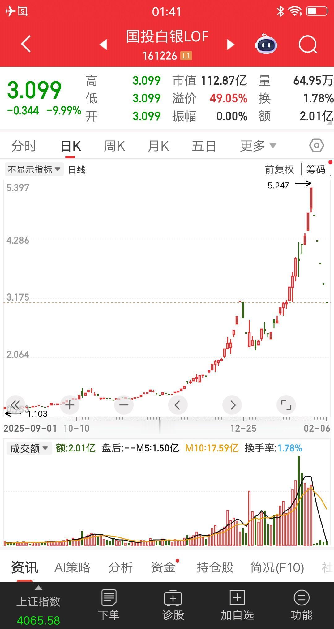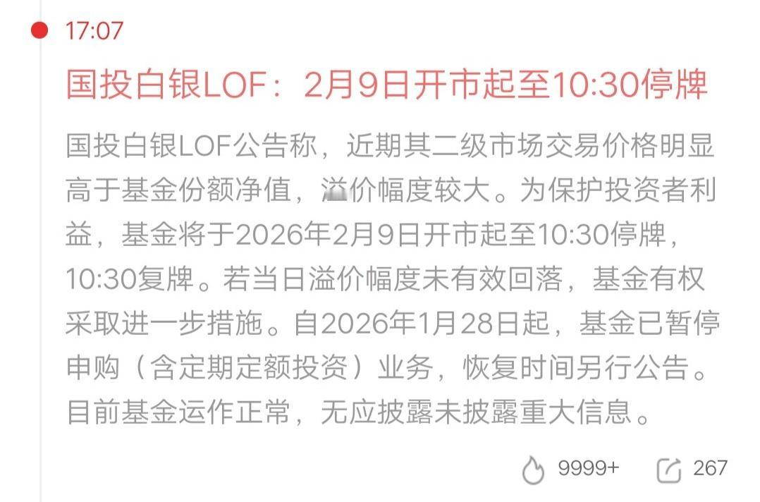 A股上周亏得最惨的一批人诞生了,就是买了国投白银LOF的散户。 连续五个一字跌停板,跌幅为40%。五天累计成交额为7.52亿,最高点当天成交额为29.72亿,还有22.2亿资金出不来。这部分人,已经亏了四十个点,就问你们惨不惨! 公告说,2月9号开市至10:30停牌。原因为二级市场交易价格明显高于基金份额净值,溢价幅度较大。 后面还有一句话,能让里面的散户,吓出一身冷汗。若当日溢价幅度未有效回落,基金有权采取进一步措施。 这话啥意思,不难理解吧。就是说还得跌,直到跌到溢价幅度合理为止。当然,多少才算合理,还得看基金公司的后续公告。 主力资金玩的太过火了,大家可以看看日线图,上涨过程大部分都是拉涨停。说白了,就是把股票拉板的玩法,直接套用到基金上。 这种一字板的跌法,主力肯定是先跑的。当然每天也会放一小部分人出来,但绝大部分人只能等开板,那时候账户亏损惨不忍睹了。 潮水退去才知道谁在裸泳,赚钱的注定是小部分人。因此一定要敬畏市场,尤其是赚钱的时候,很容易心态走样。 亏钱的股友,调整好心态,一定要乐观。