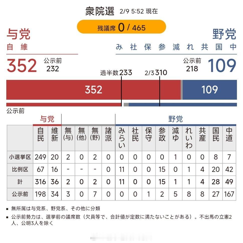 日本众议院总共465个坑过半数(1/2)是233安定多数244绝对安定多数261压倒多数(2/3)是310(自民已单独达成)过3/4是349(现在的自维执政联盟已经达成)加上野党中同为政策右倾路线的的参政和国民民主右翼席位能够达到接近400,占总数85+%