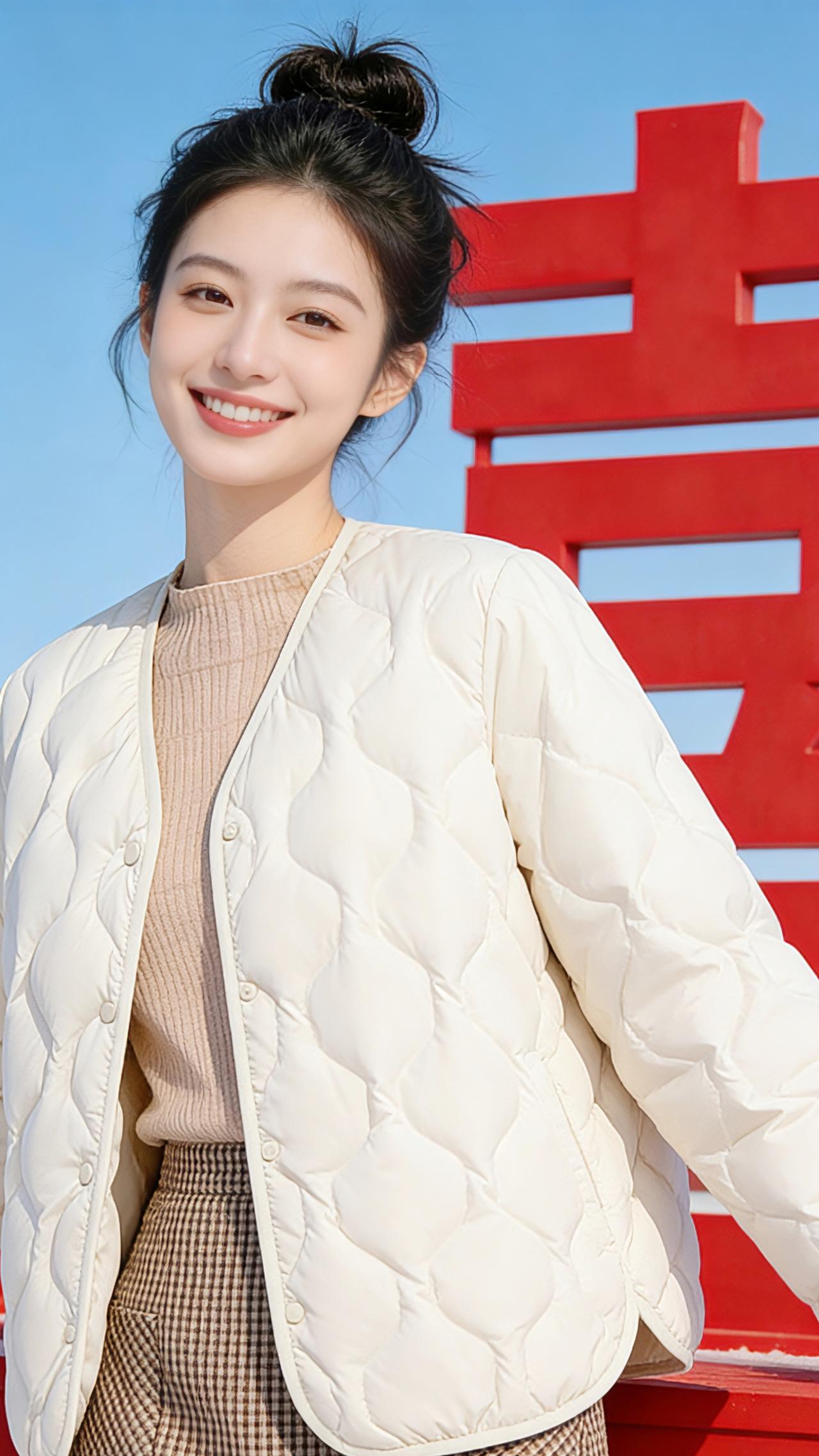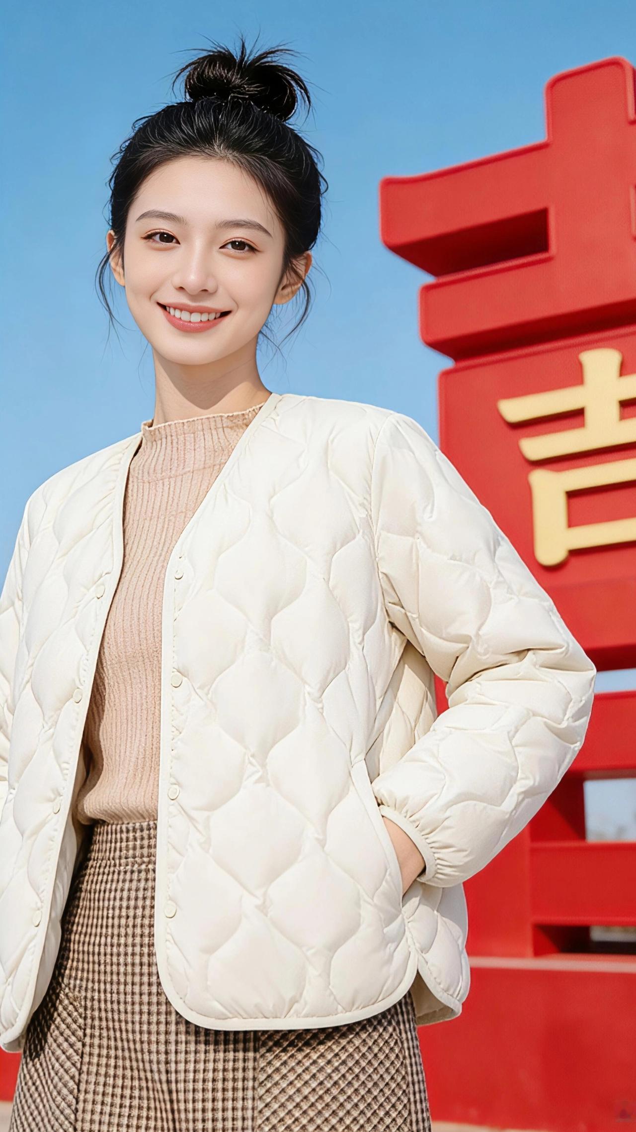 雪日里的白 雪落在老城的檐角时,她正穿过铺满碎玉的街。米白色的羽绒服像一团蓬松的云,裹住了料峭的寒风,也裹住了二十岁的轻盈。 丸子头松松挽着,几缕碎发被风吹得贴在颈窝,是独属于少女的慵懒。羽绒服上菱形格纹的绗缝里,凝着细雪的光,随着她迈步的节奏轻轻起伏。浅驼色针织衫的领口露出一小截,衬得肤色像雪后初晴的天空,干净又明亮。 她在那方巨大的红色“吉”字前站定。热烈的红与纯净的白撞出惊人的暖意,就像腊月里的糖炒栗子,烫得人心里发甜。笑容先于声音漫开,梨涡盛着阳光,比雪后的日头还要暖。 风掀起羽绒服的下摆,格子裙的纹路在雪光里若隐若现。她微微侧身时,衣料摩擦的轻响混着远处商铺的爆竹声,成了新年最温柔的序曲。这一身不张扬的素净,偏偏在皑皑白雪里生出无限生机,原来最好的年味,从不是浓墨重彩,而是像这样——一身暖,一笑甜,一眼便让人想起春天。 高级感穿搭 新年穿搭 冬季穿搭 小个子穿搭