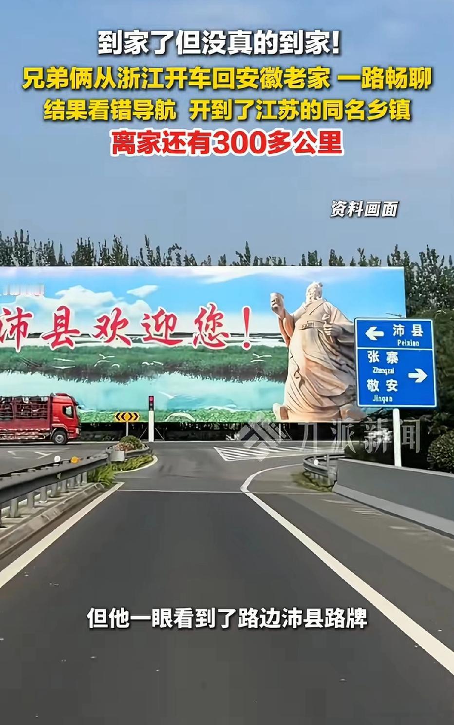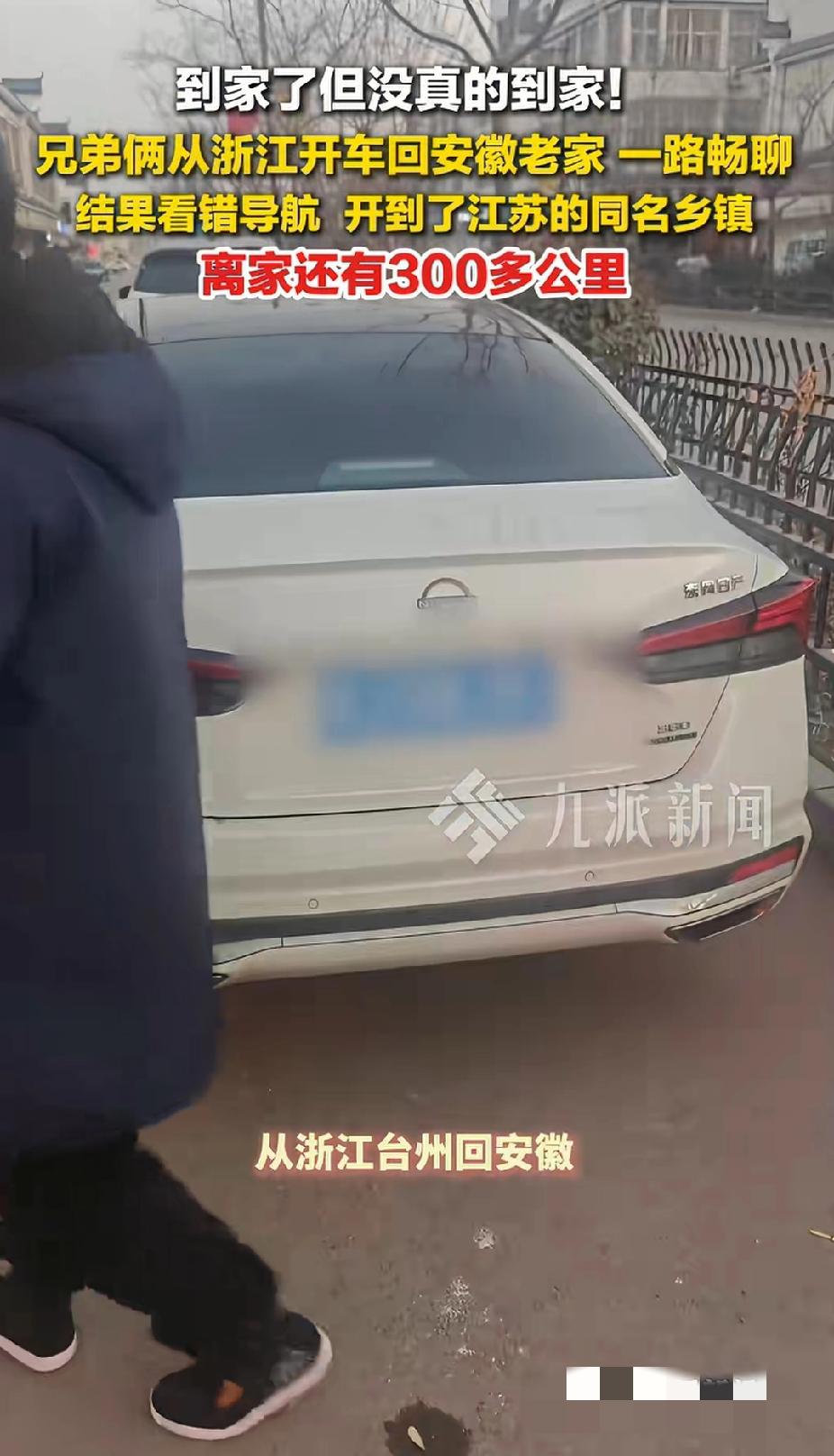 近日安徽阜阳,2名男子从浙江开车回安徽老家,一路上有说有笑,导航到目的地时,却笑不出来了,一名男子说出了自己的经历! 一名男子说,自己和兄弟两人放假了,很开心,从浙江开车回老家安徽,谁料,在导航的时候,输入朱寨镇,没成想,导航把他们带到了江苏一个同名的镇去了,两人路上光顾着聊天,没注意看路线,到了沛县的时候,才发现走错道了! 目前两人距离老家还有300多公里,随后不得不再开上4个小时才安全到达老家朱寨镇!这就是传说中的到家了,但又没真的到家吗?